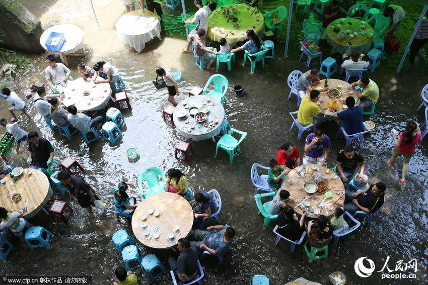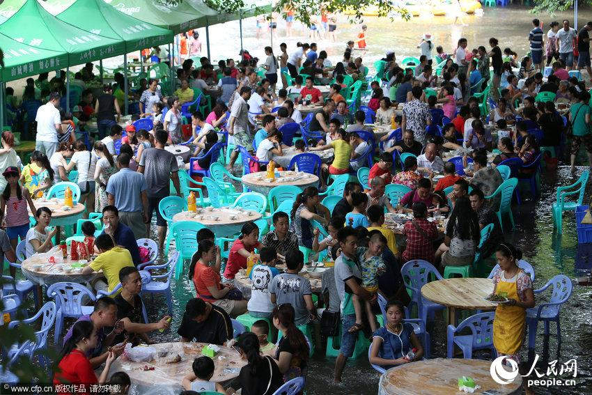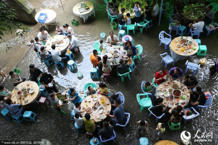 酷暑が耐え難いほどの夏の20日、重慶北碚偏巖古鎮(zhèn)の川辺には足を流れに浸して食事を取るという獨(dú)特の避暑の方法で過ごす人たちの姿が見られた。テーブルやイスは川の流れの中に置かれ、利用客は裸足でテーブルにつき、足を川の流れに浸して涼みながら料理を楽しむことができる。気溫30℃以上の暑さだが、足は20℃以下の涼しい水に浸し、巨大な木の陰の下で風(fēng)に吹かれるのは、非常に爽やかだ。毎日食事時(shí)になると、北碚偏巖古鎮(zhèn)の川辺には200近くのテーブルが置かれ、各地から集まった利用客が豆花(大豆を使ったデザートの一種)や臘肉(肉の加工品)、羊の串焼きなどを楽しむ。人民網(wǎng)が伝えた。(編集YH)