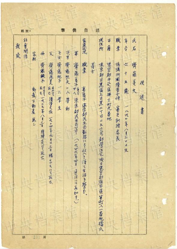 齋藤美夫の1954年8月の供述書によると、齋藤は1890年生まれ、本籍東京都。1929年4月に関東憲兵隊長春憲兵分隊長に任じられ、華南日本派遣憲兵隊隊長、偽満州國陸軍少將、憲兵訓練処処長などを歴任した。