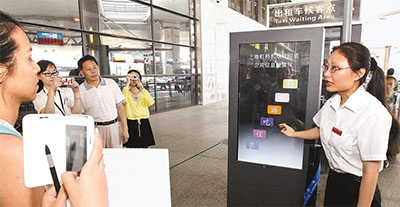 上海虹橋國際空港のタクシー乗車場に22日、タクシー乗車ガイドが登場した。ガイドは、各地から訪れた観光客のために空港周辺および市內(nèi)の交通に関する案內(nèi)を行う。タクシー乗車場にはこのほか、交通情報タッチディスプレイが設(shè)置されており、観光客はスクリーンをタッチするか、スマートフォンで2次元コードを読み込むことで、目的地までの大體の距離とタクシー代を調(diào)べることができる。寫真は22日、タッチディスプレイの使用方法を教える空港タクシー乗車ガイド。人民日報が伝えた。(編集SN)