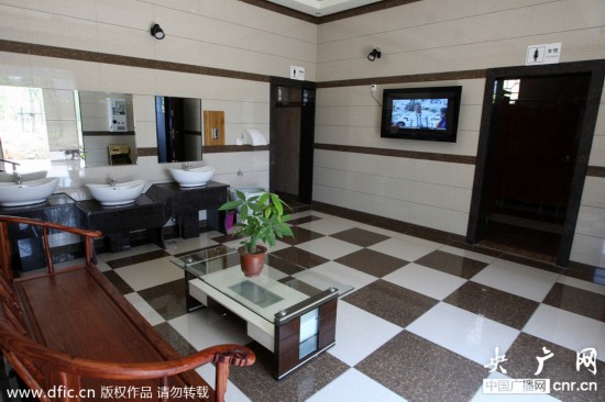 同公衆(zhòng)トイレには、テレビやソファー、テーブルなどが置かれた休憩場所も設けられている。(編集KN)