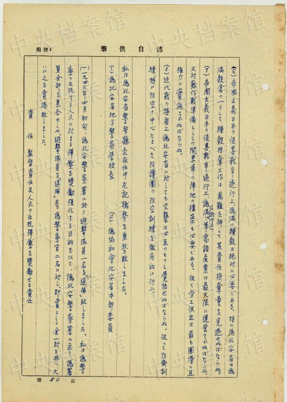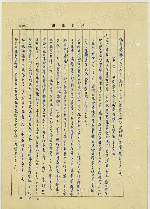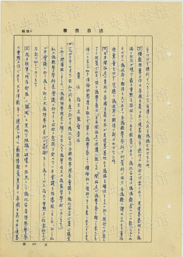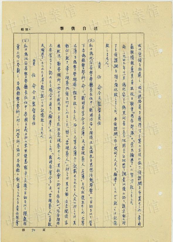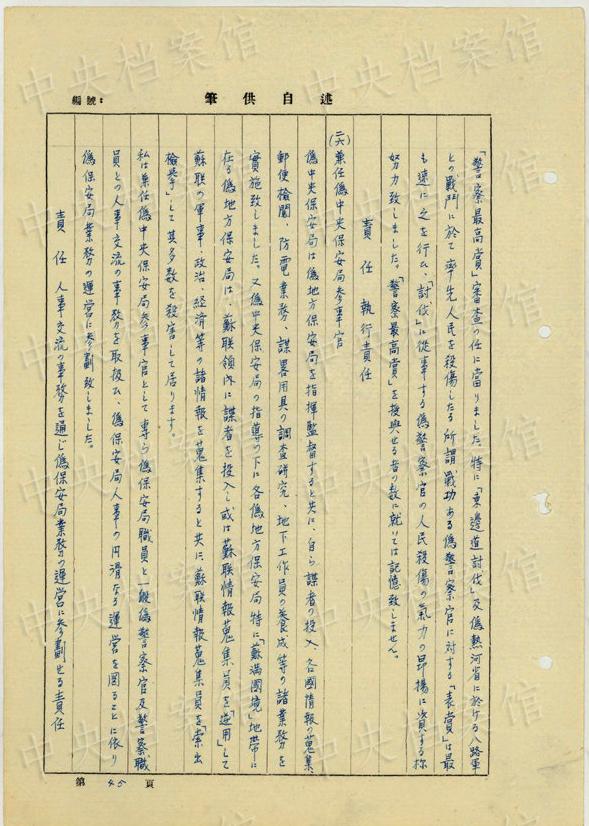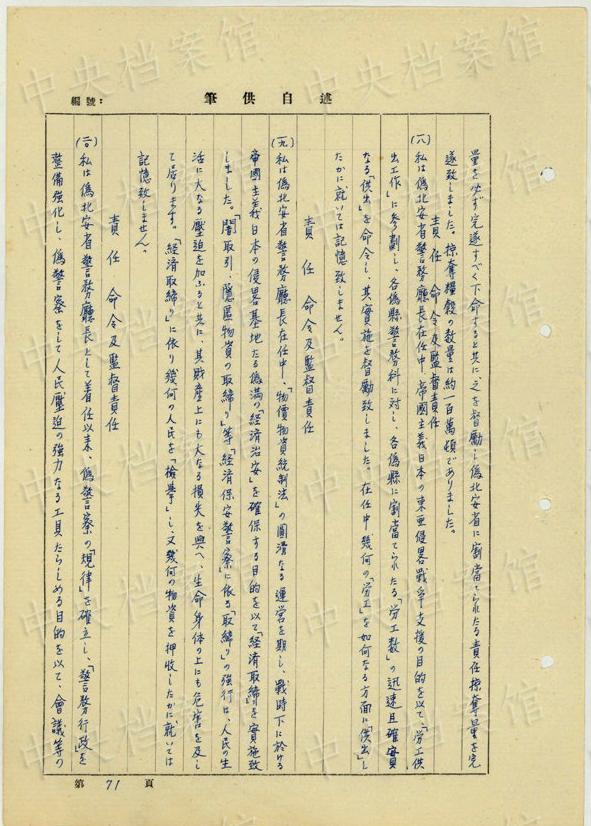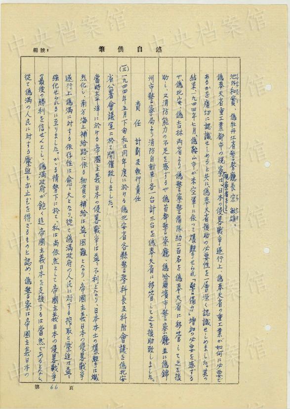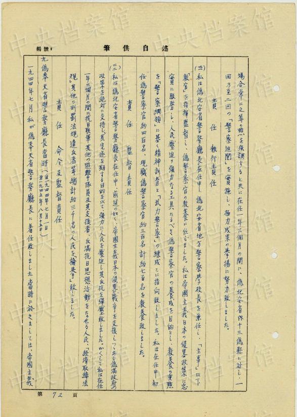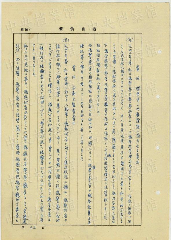 1944年7月から1945年8月まで偽奉天省警務(wù)庁庁長(zhǎng)として在任中、部下に命令して刑法違反者を逮捕し、「一市六県のみにて中國(guó)人民一萬(wàn)二千一百八十名を『検挙』し四千五百六十五名を偽検察庁に送致致しました。偽検察庁に送致せられたる者の中、十四名は死刑を宣告せられ、偽監(jiān)獄に於て屠殺せられました」(編集MA)