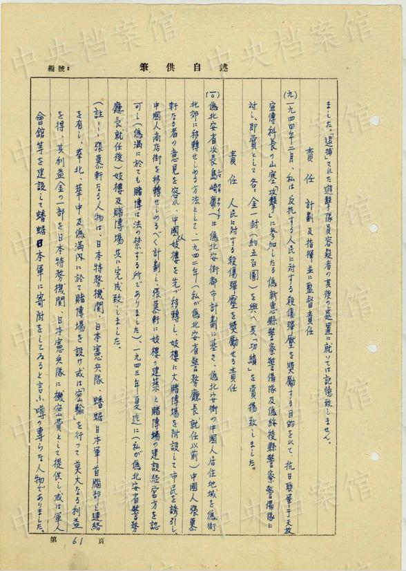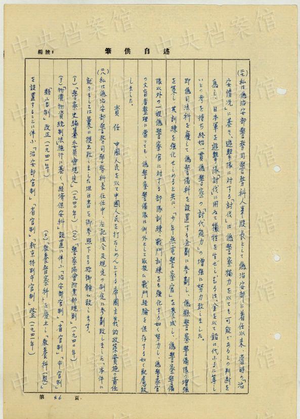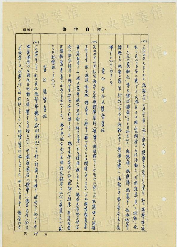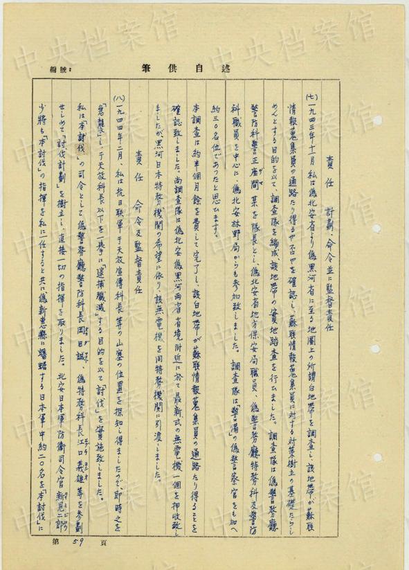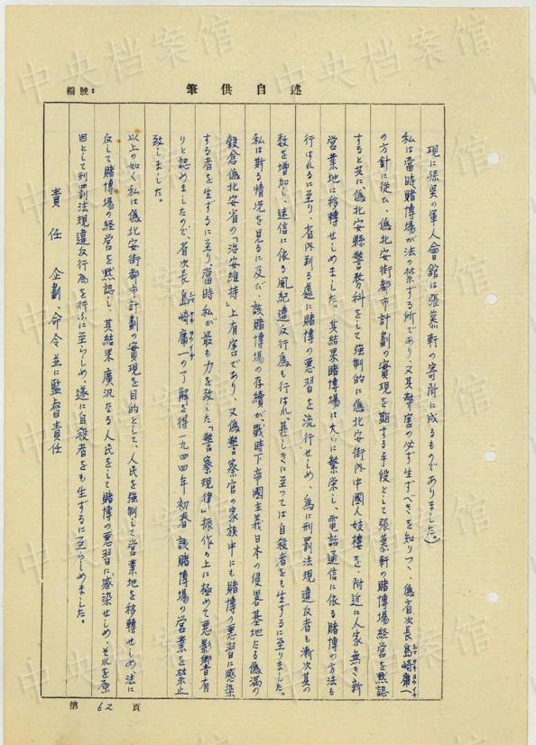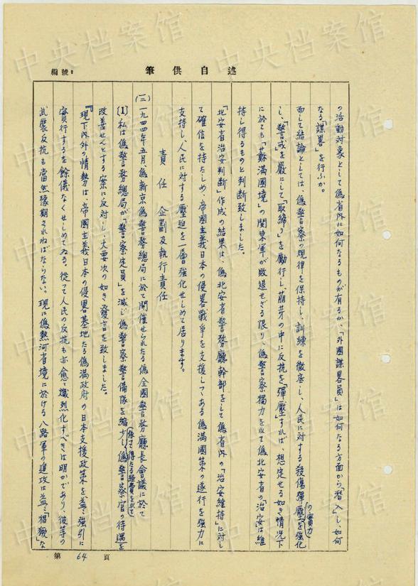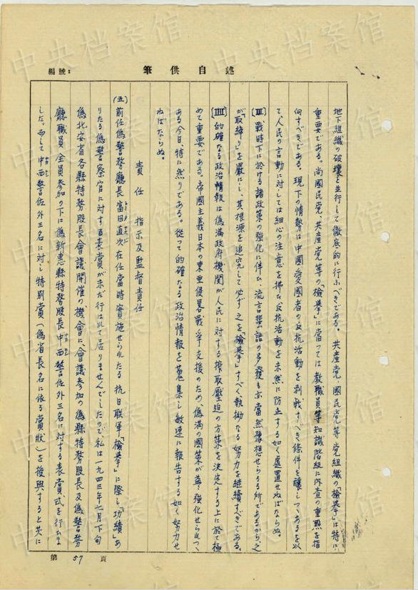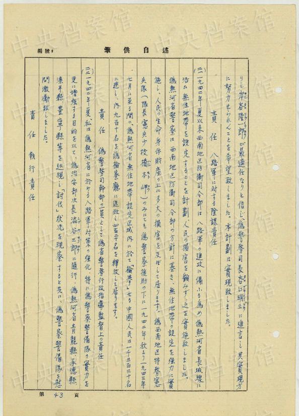 1944年7月から1945年8月まで偽奉天省警務(wù)庁庁長(zhǎng)として在任中、部下に命令して刑法違反者を逮捕し、「一市六県のみにて中國(guó)人民一萬(wàn)二千一百八十名を『検挙』し四千五百六十五名を偽検察庁に送致致しました。偽検察庁に送致せられたる者の中、十四名は死刑を宣告せられ、偽監(jiān)獄に於て屠殺せられました」(編集MA)