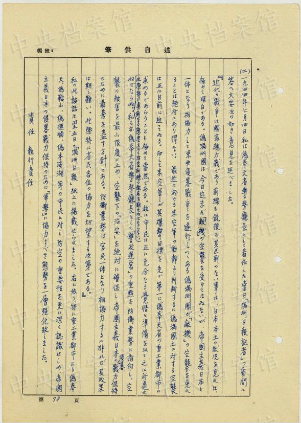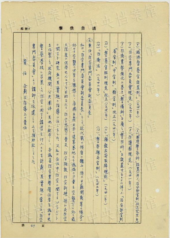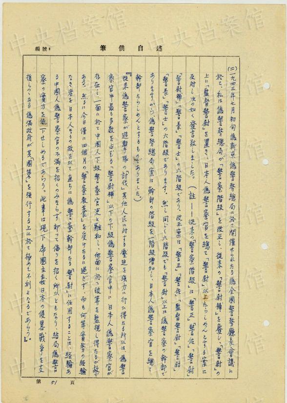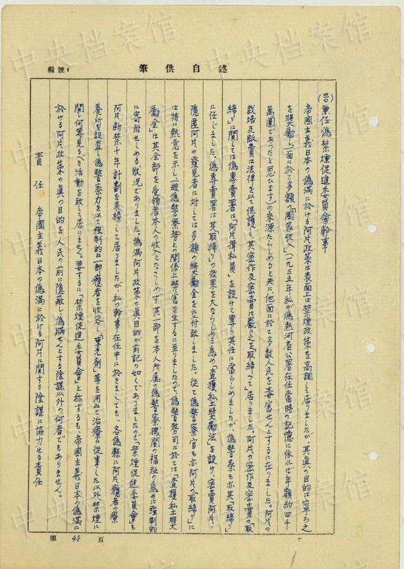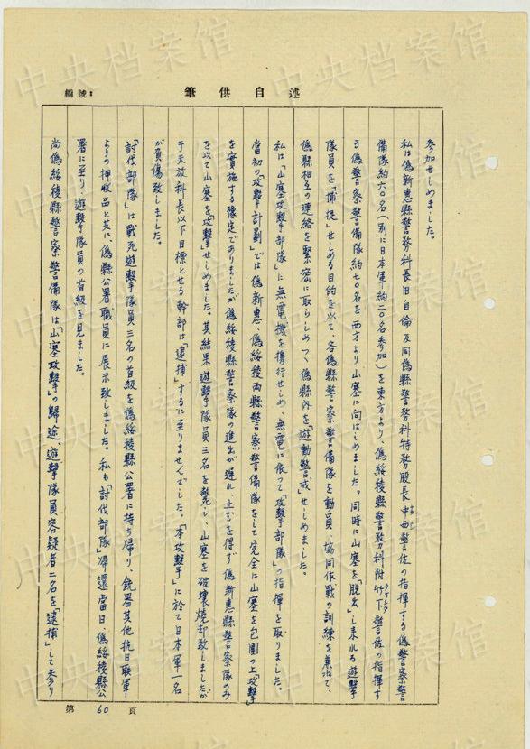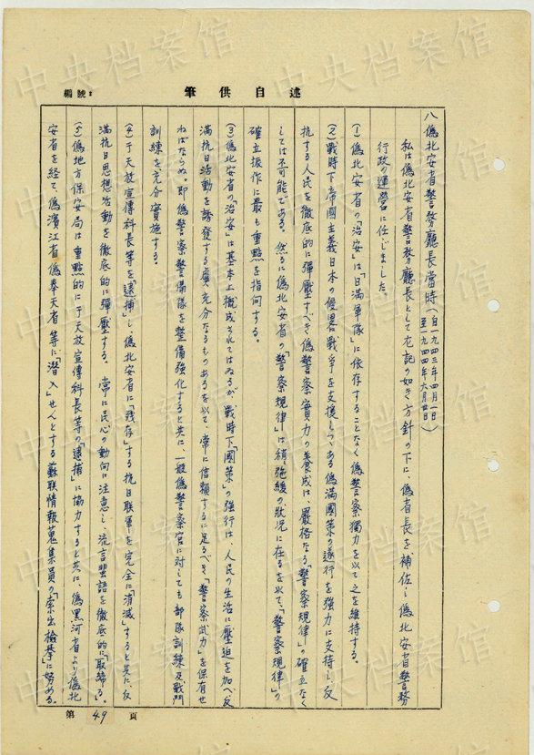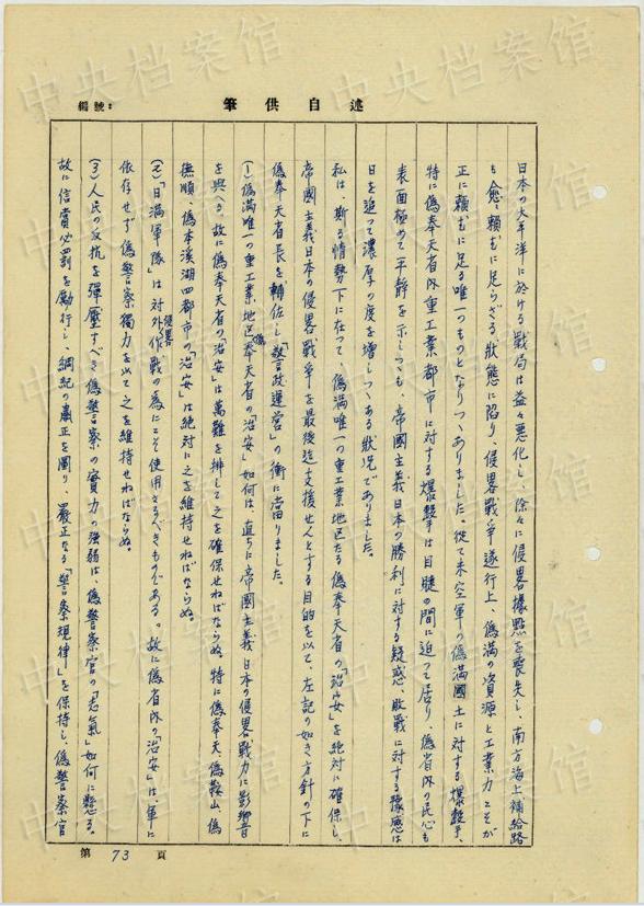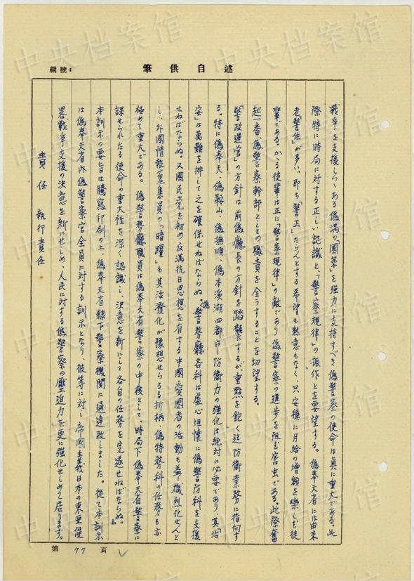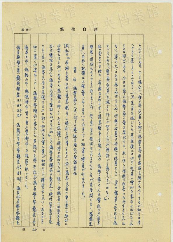 1944年7月から1945年8月まで偽奉天省警務(wù)庁庁長(zhǎng)として在任中、部下に命令して刑法違反者を逮捕し、「一市六県のみにて中國(guó)人民一萬(wàn)二千一百八十名を『検挙』し四千五百六十五名を偽検察庁に送致致しました。偽検察庁に送致せられたる者の中、十四名は死刑を宣告せられ、偽監(jiān)獄に於て屠殺せられました」(編集MA)