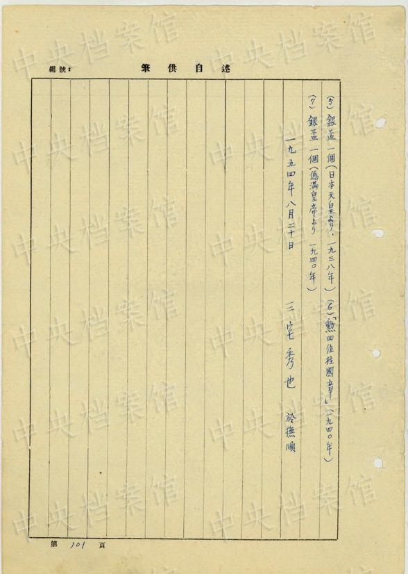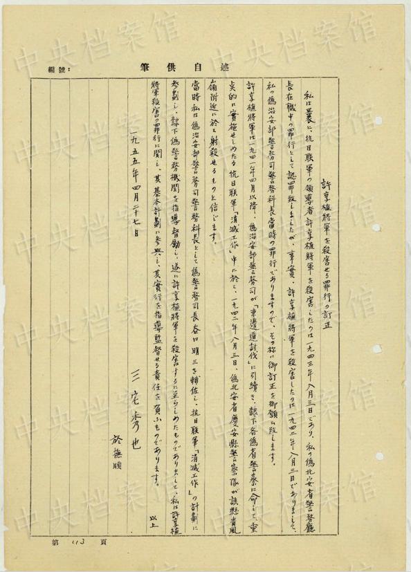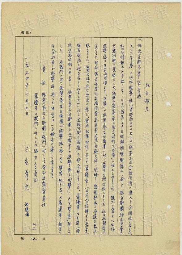 日本人戦犯?三宅秀也の1954年8月から1955年4月の供述書によると、三宅は1902年に日本の兵庫(kù)県で生まれ、偽満洲國(guó)熱河省警務(wù)庁警務(wù)科科長(zhǎng)と偽奉天省警務(wù)庁庁長(zhǎng)を務(wù)めた。