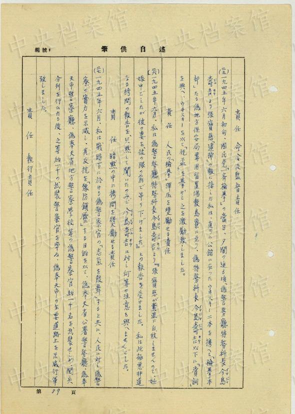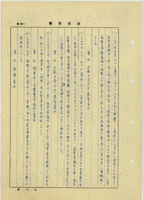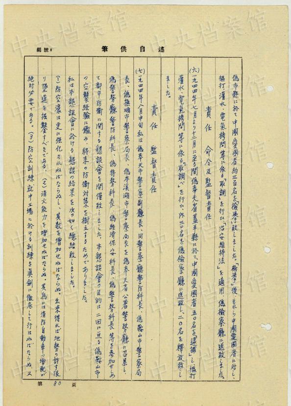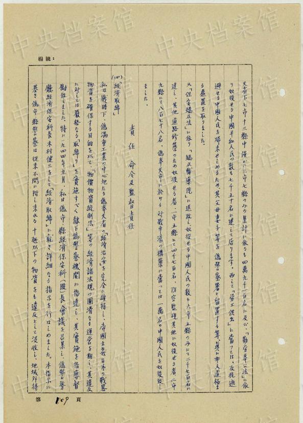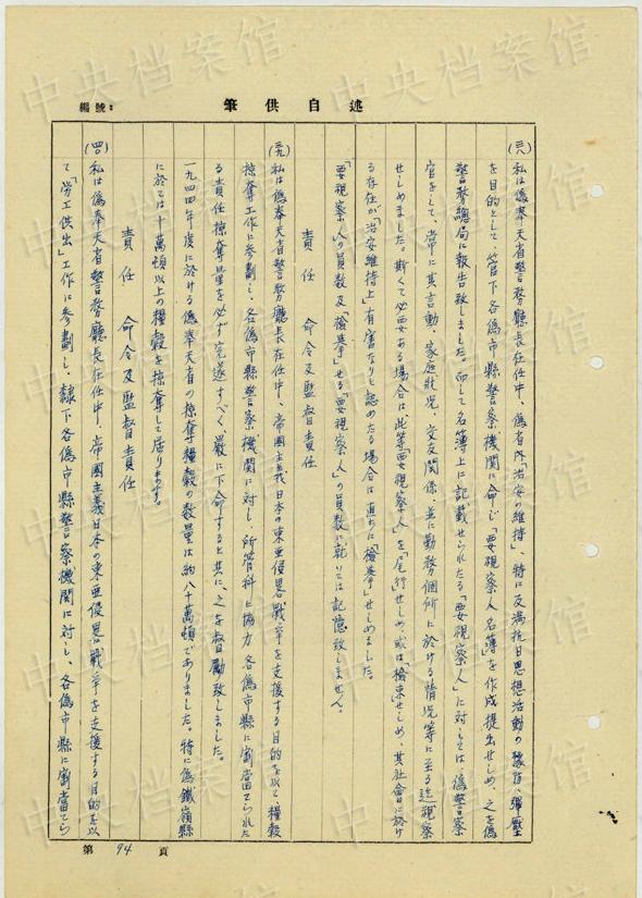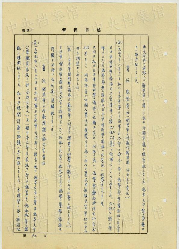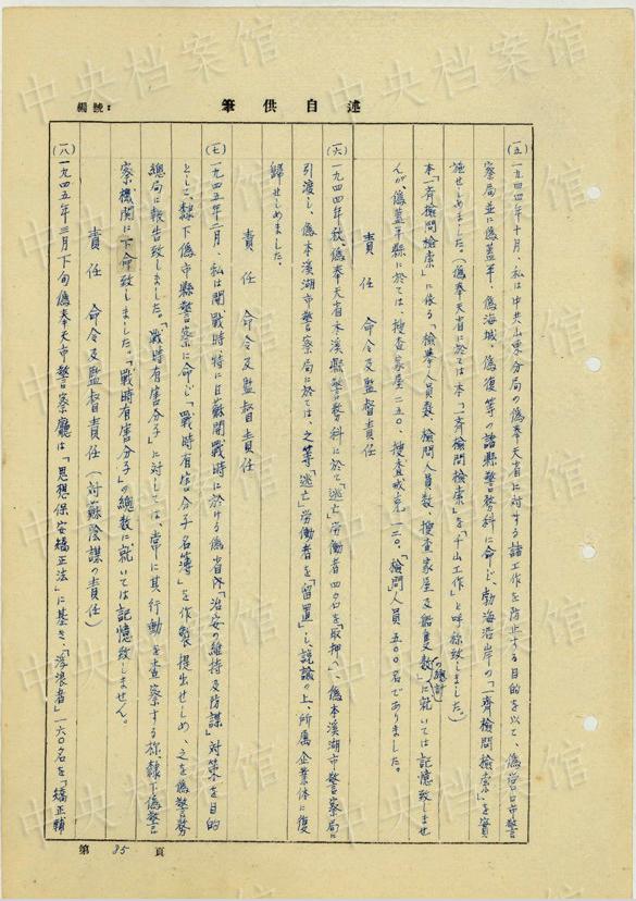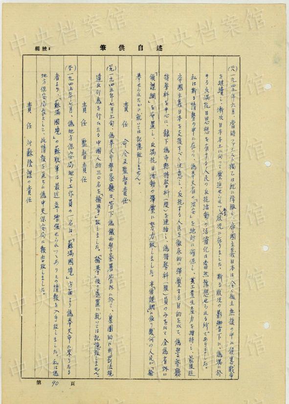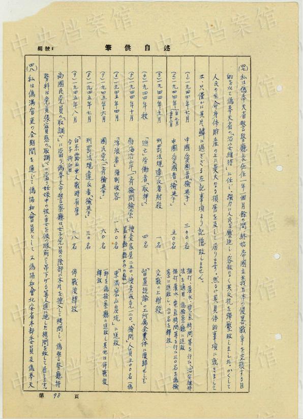 1944年7月から1945年8月まで偽奉天省警務(wù)庁庁長(zhǎng)として在任中、部下に命令して刑法違反者を逮捕し、「一市六県のみにて中國(guó)人民一萬(wàn)二千一百八十名を『検挙』し四千五百六十五名を偽検察庁に送致致しました。偽検察庁に送致せられたる者の中、十四名は死刑を宣告せられ、偽監(jiān)獄に於て屠殺せられました」(編集MA)