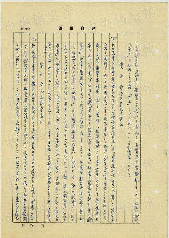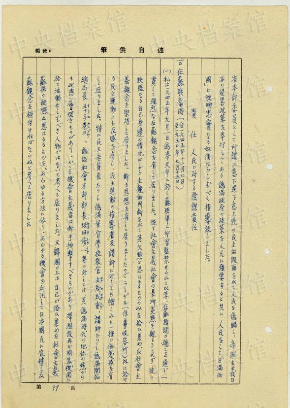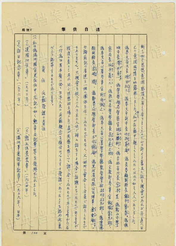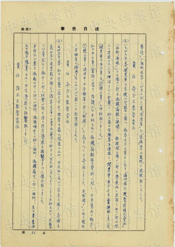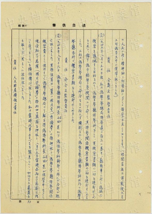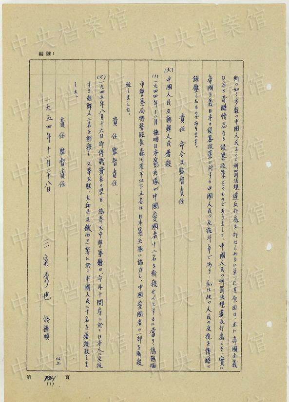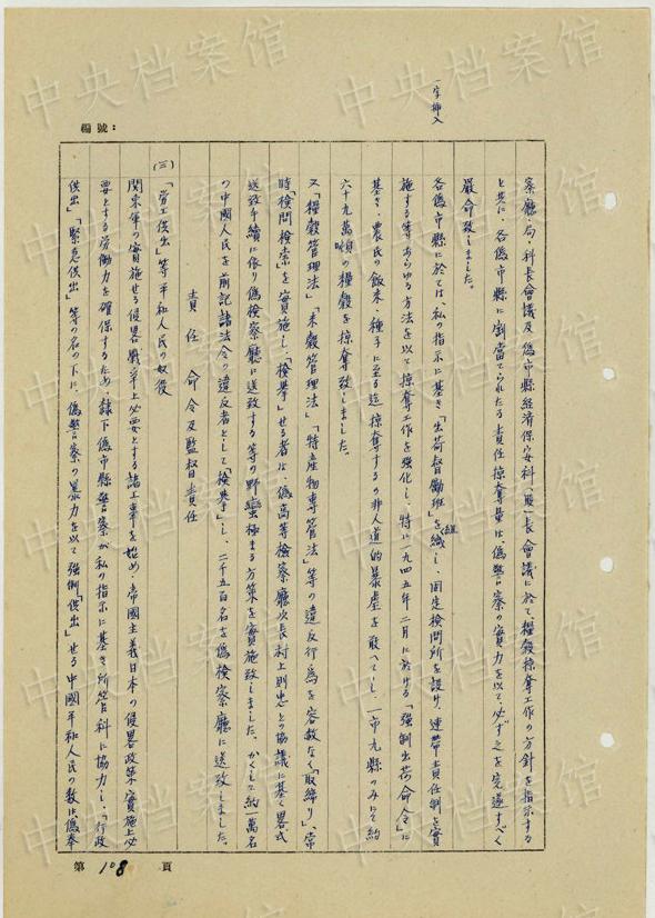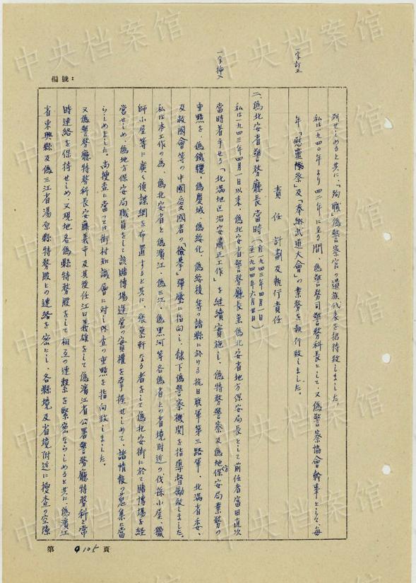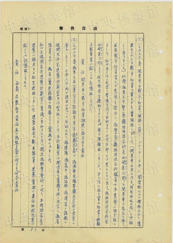 1944年7月から1945年8月まで偽奉天省警務(wù)庁庁長(zhǎng)として在任中、部下に命令して刑法違反者を逮捕し、「一市六県のみにて中國(guó)人民一萬(wàn)二千一百八十名を『検挙』し四千五百六十五名を偽検察庁に送致致しました。偽検察庁に送致せられたる者の中、十四名は死刑を宣告せられ、偽監(jiān)獄に於て屠殺せられました」(編集MA)