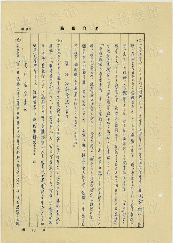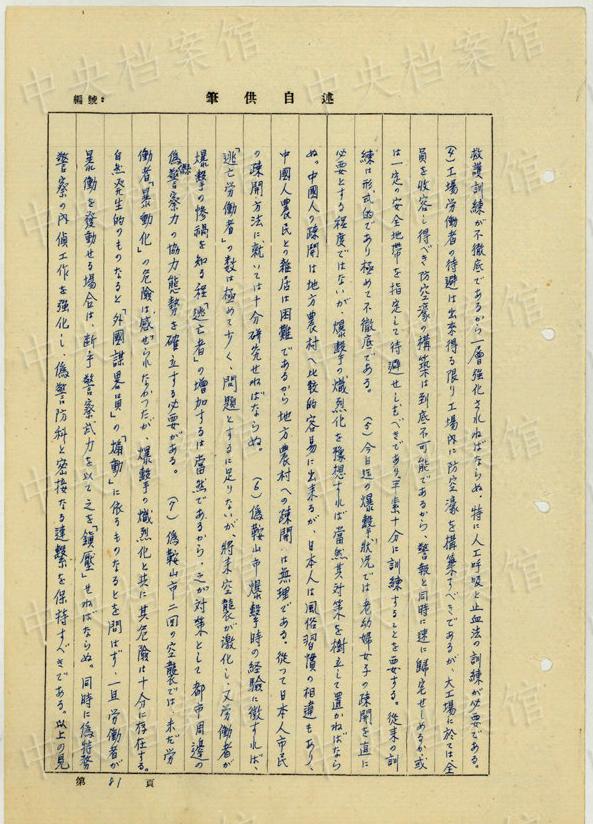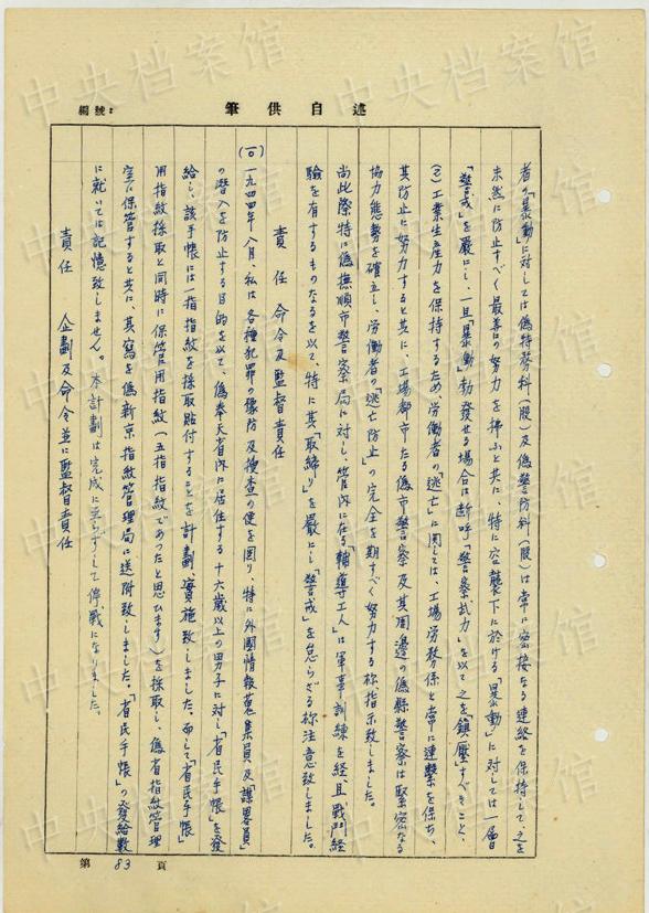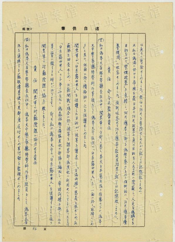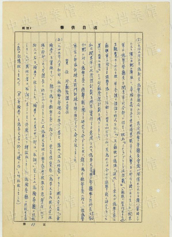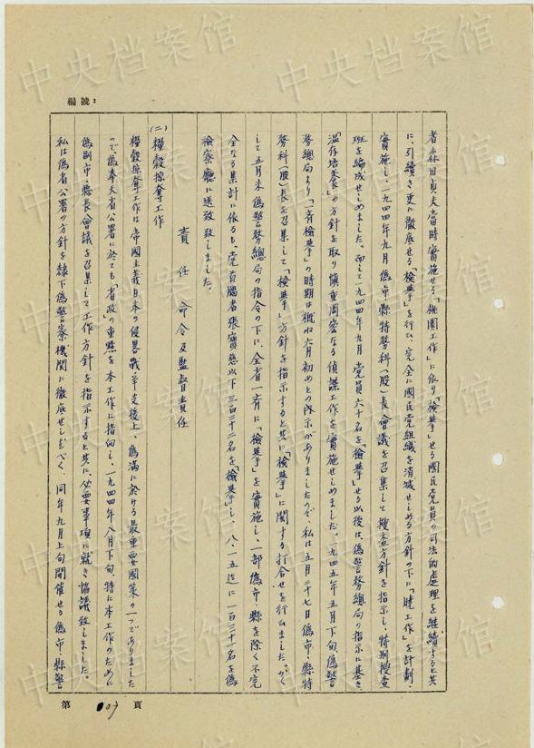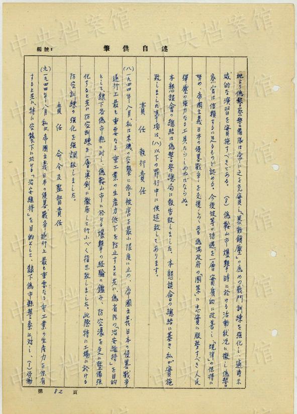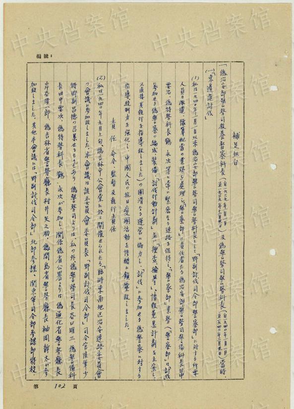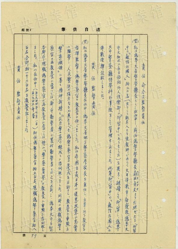 1944年7月から1945年8月まで偽奉天省警務(wù)庁庁長(zhǎng)として在任中、部下に命令して刑法違反者を逮捕し、「一市六県のみにて中國(guó)人民一萬(wàn)二千一百八十名を『検挙』し四千五百六十五名を偽検察庁に送致致しました。偽検察庁に送致せられたる者の中、十四名は死刑を宣告せられ、偽監(jiān)獄に於て屠殺せられました」(編集MA)