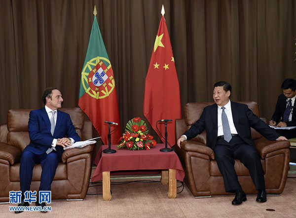 習主席はシルヴァ大統(tǒng)領への挨拶をポルタス副首相に託したうえで、ポルタス副首相が中國代表団の応接のためにわざわざ現(xiàn)地を訪れたことに謝意を表明?!钢袊铣¥衰荪毳去毪趣伍v係を大変重視している。両國の包括的?戦略的パートナーシップ構築から來年で10年になる。雙方がこれを契機に経済?貿易、技術、投資、農?畜産業(yè)、観光、海洋分野の実務協(xié)力を深化し、両國関係を新たな段階へと押し上げることを希望する。中國は実力あるさらに多くの中國企業(yè)による対ポルトガル投資を奨勵する。ポルトガル側が両國の企業(yè)と人員の交流を一層円滑化することを希望する。中國とポルトガルは共に長い海岸線と豊かな海洋資源を持ち、海洋経済の発展、海洋資源の利用の面で協(xié)力を強化できる」と述べた。