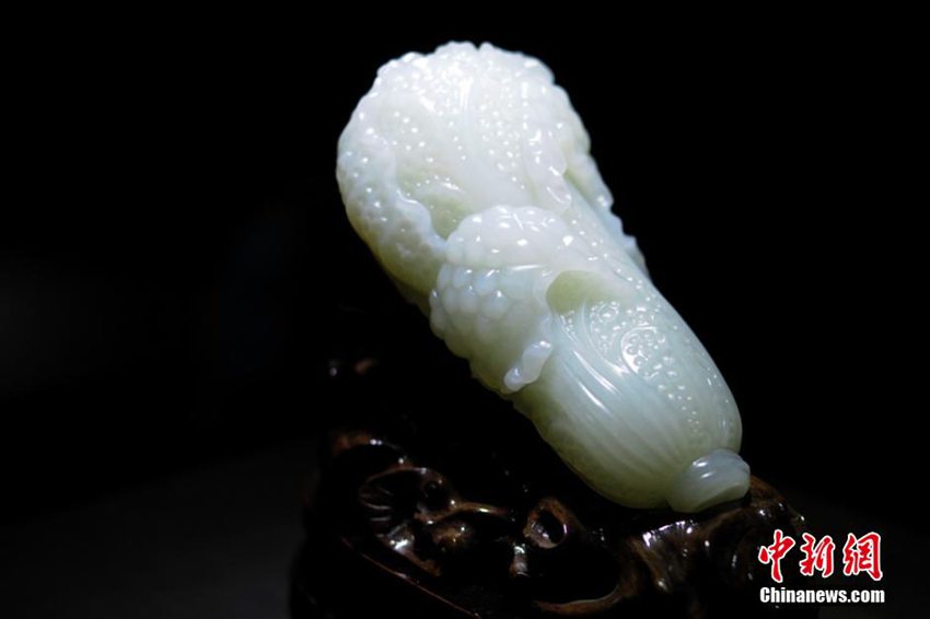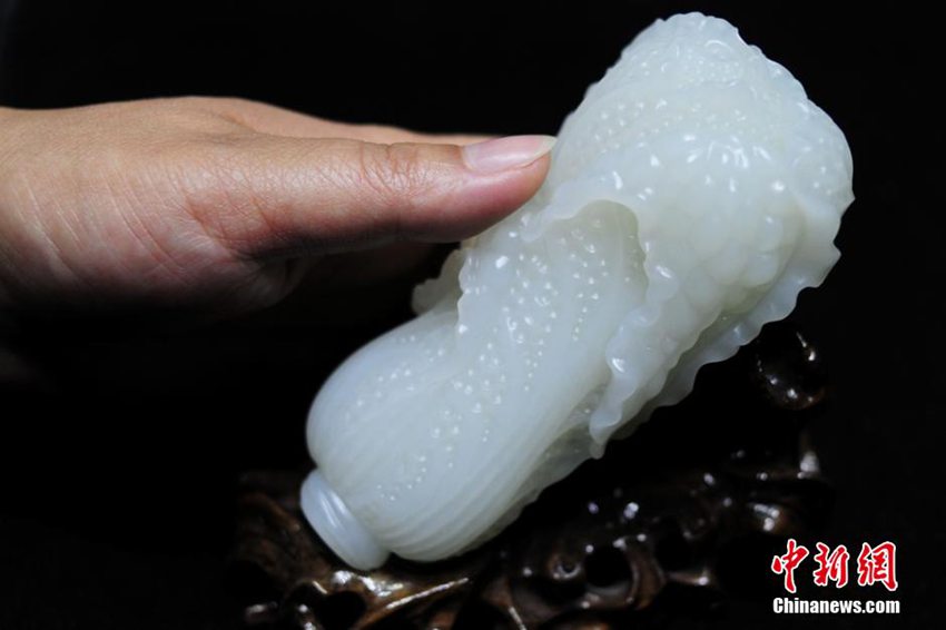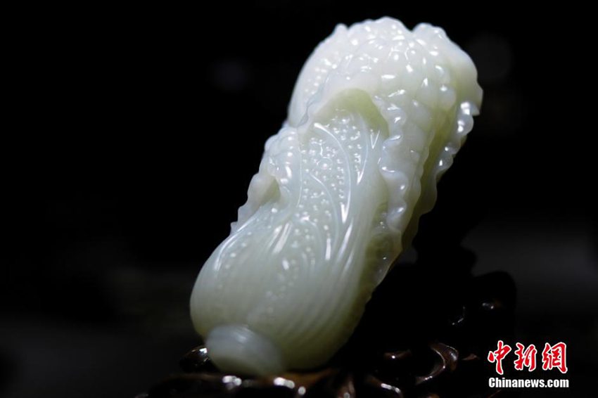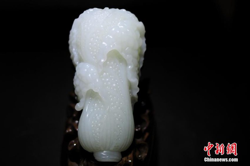 寫真は23日、新疆維吾爾(ウイグル)自治區(qū)烏魯木斉(ウルムチ)で撮影された重さ397グラムの高品質(zhì)の和田玉の白菜。所有者は158萬元(約2594萬円)の売値をつけている。この玉は和田玉の中の高品質(zhì)のもので、有名な玉彫刻師が彫刻したため価値が高い。中國語では、「白菜」は「百財」と発音が似ており縁起が良いため、中國人に人気のある題材だ。中國新聞網(wǎng)が伝えた。(編集YH)