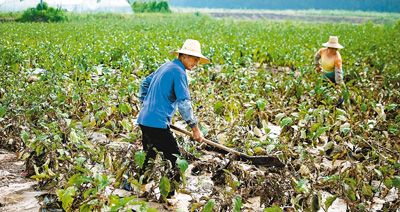| 26日、江西省九江県新合鎮(zhèn)凌華野菜生産基地で、洪水で冠水した野菜畑の後片付けを行う野菜農(nóng)家 |