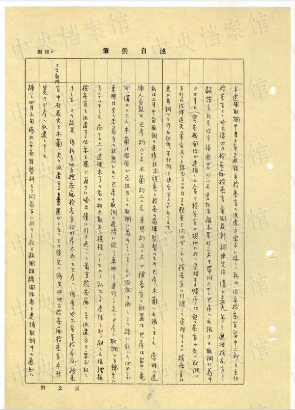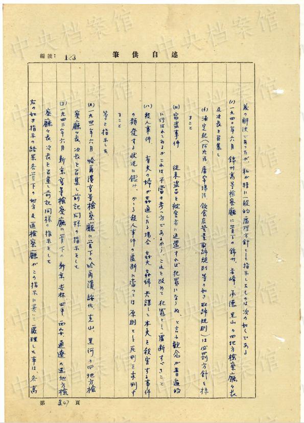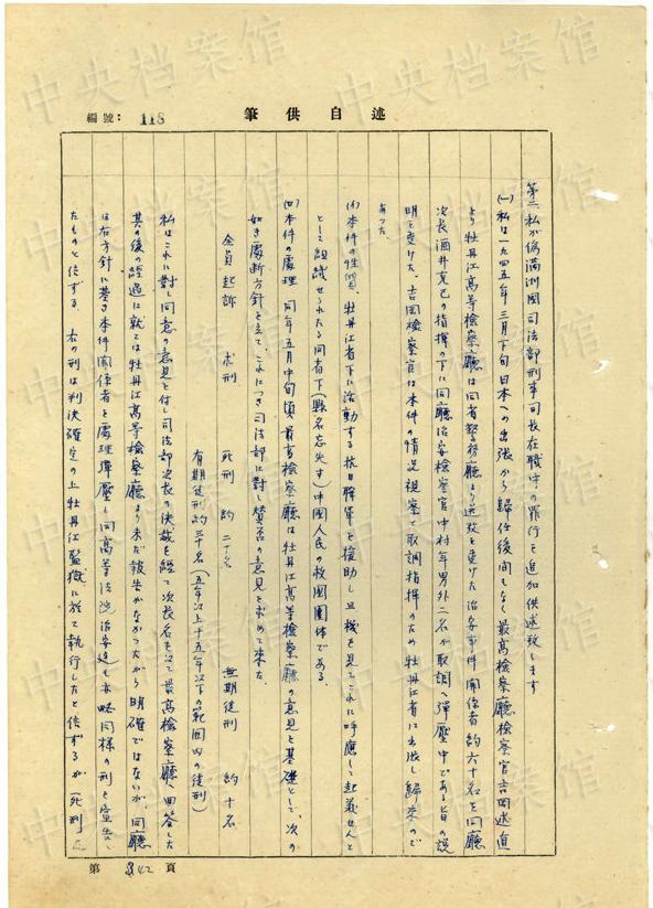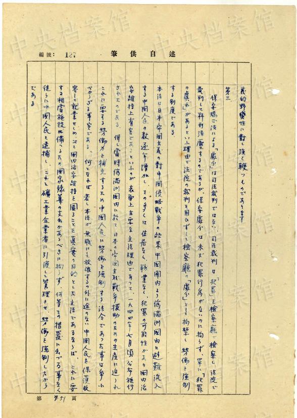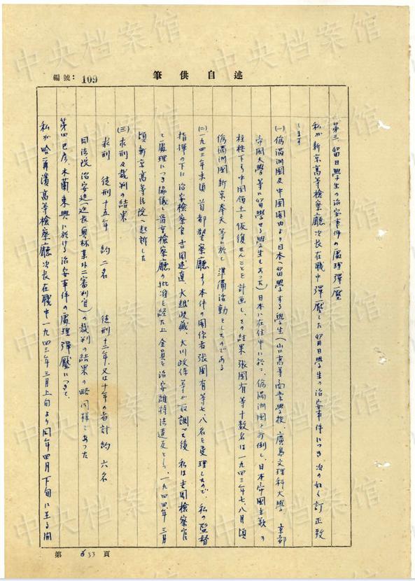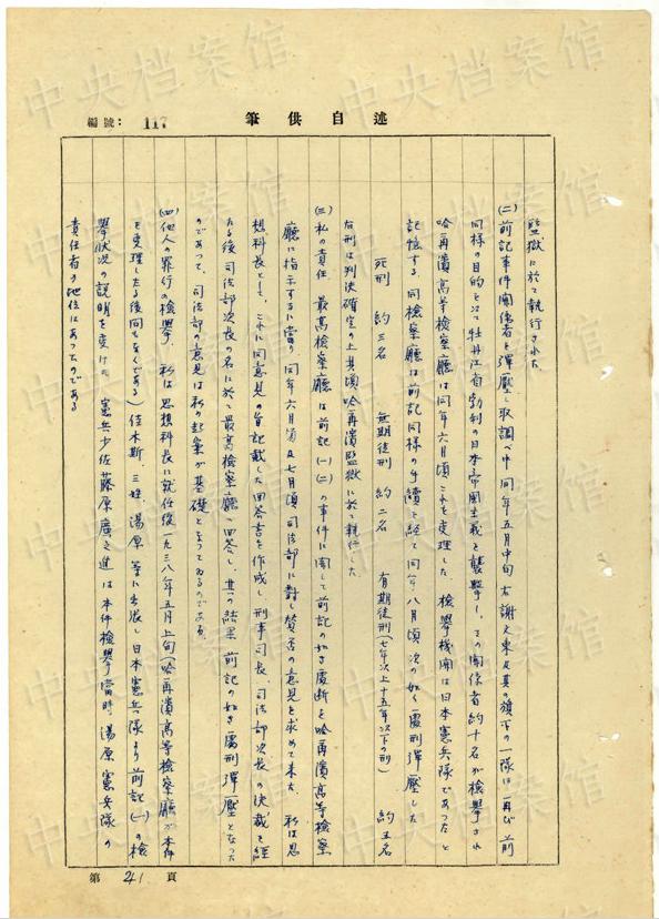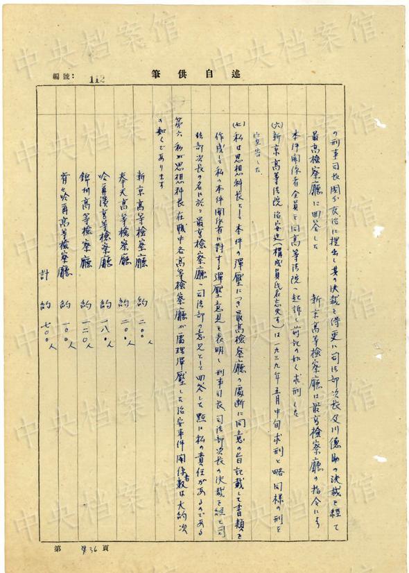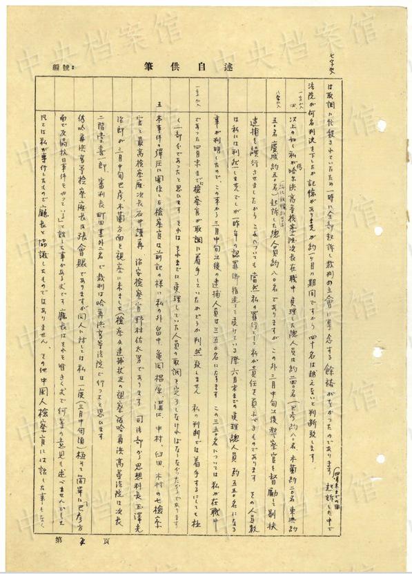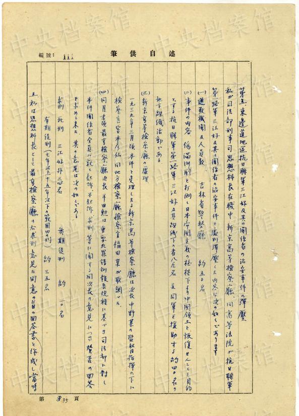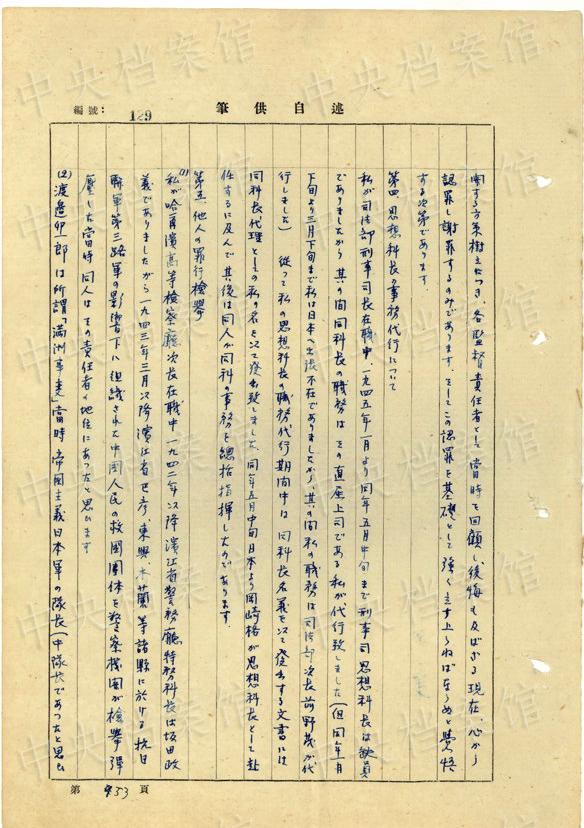 1938年5月から1939年5月まで、「私が思想科長在職中(中略)治安事件として中國人民を処罰弾圧した數(shù)は一九三八年五?六月頃哈爾濱高等検察庁及法院が処理した約四十名(中略)を初めとし合計約三百名である」