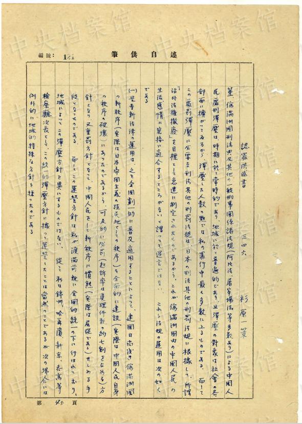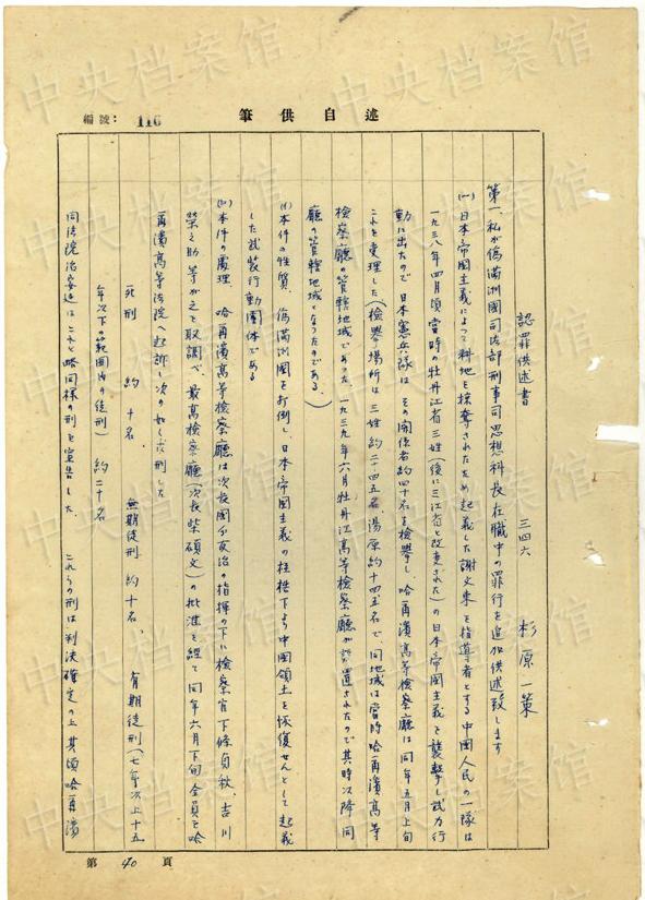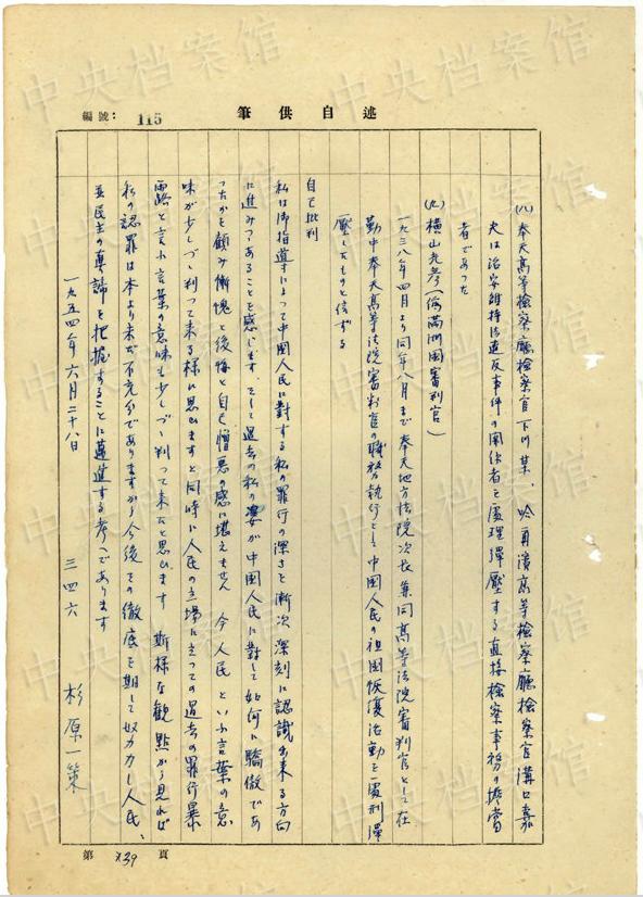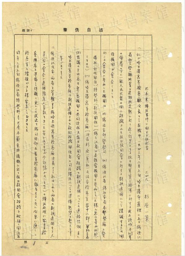 日本人戦犯?杉原一策の1954年6月の供述書によると、杉原は1938年5月に偽満洲國司法部刑事司思想科科長、1945年1月に偽満洲國司法部刑事司長などに任じられ、同年11月に捕虜となった。