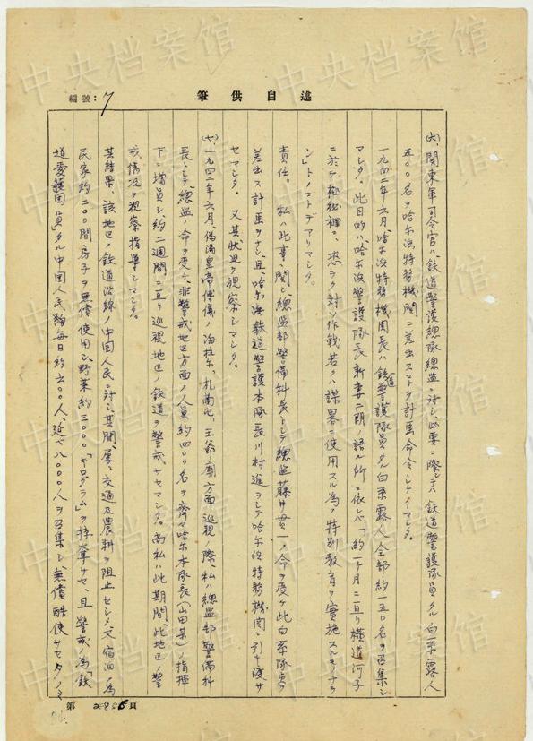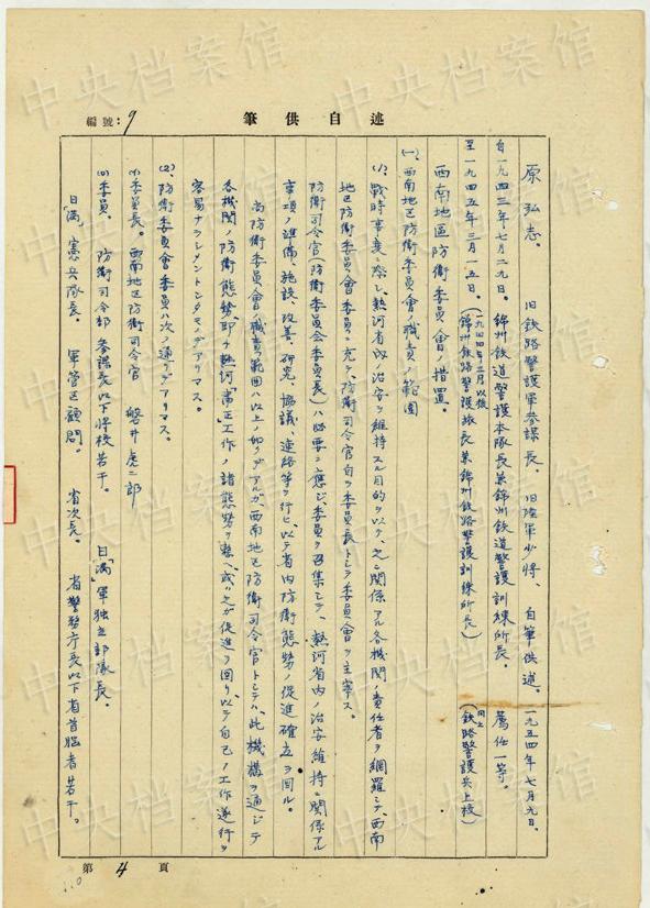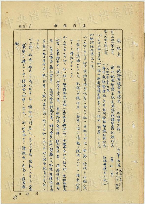 原弘志の1954年6月の供述書によると、原は1895年岡山県生まれ。1933年3月から中國東北部で中國侵略戦爭に參加し、偽満州國鉄道警護総隊総監(jiān)部警備科長、鉄路警護軍少將參謀長などを歴任し、1945年9月に捕虜となった。