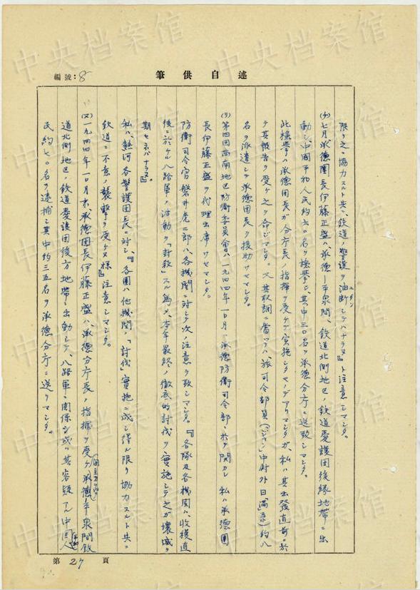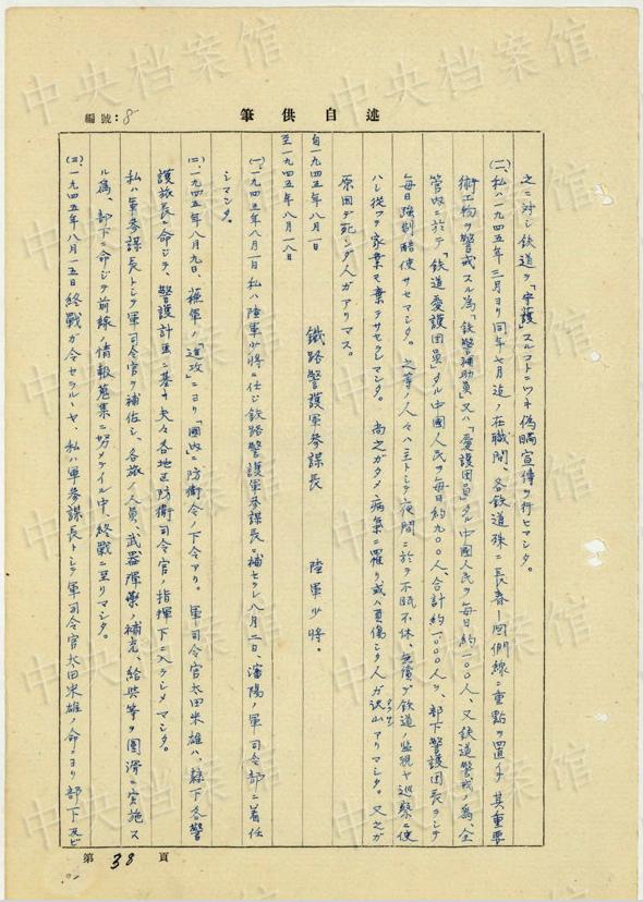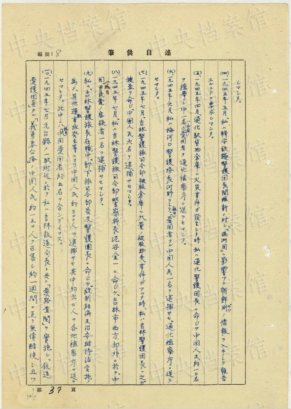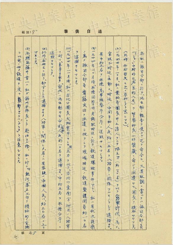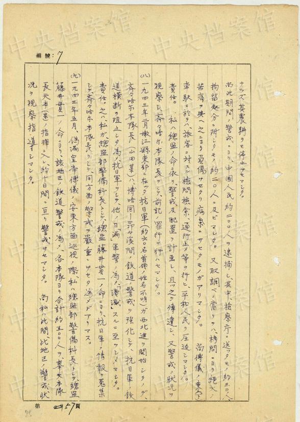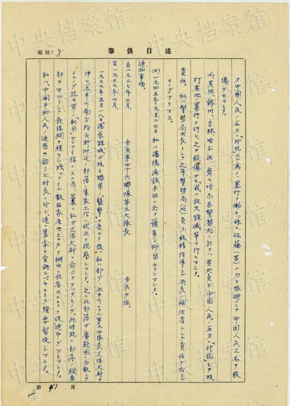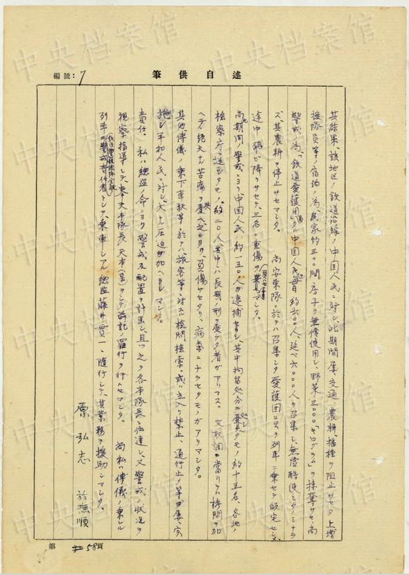 1937年5月19日、「部下ノ中隊ニ命ジテ城內(nèi)ノ中國人民ノ家ニ対シ検問検索ヲ?qū)g施セシメタ際、部下ノ一名ハ中國人民(子供、男)ヲ射撃シテ頭部ニ重傷サセマシタ。被害者ハ頭部ノ傷デアルカラ既ニ死亡シタコトト推定シマス」。