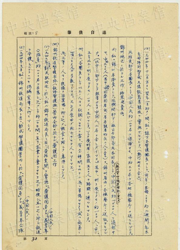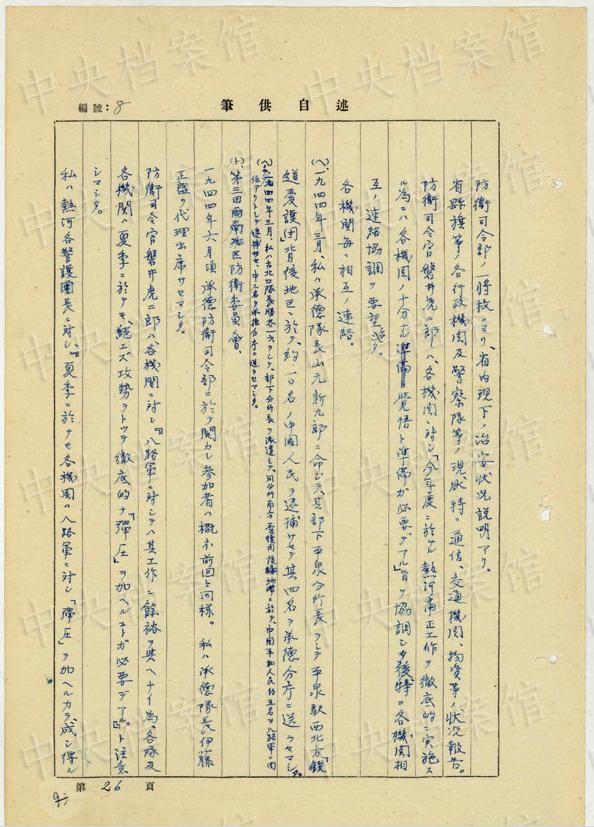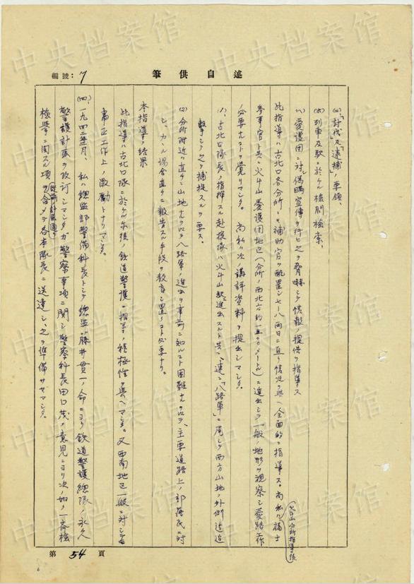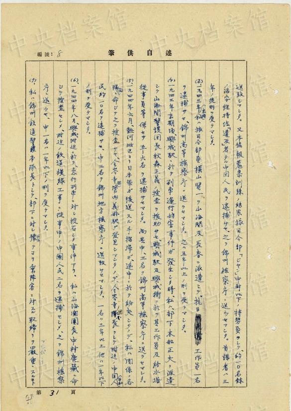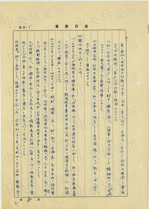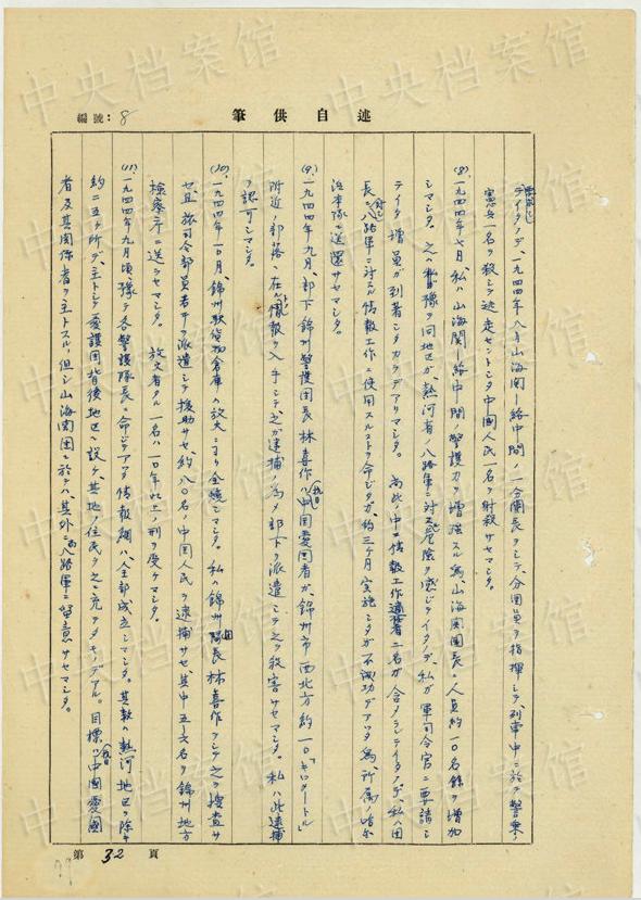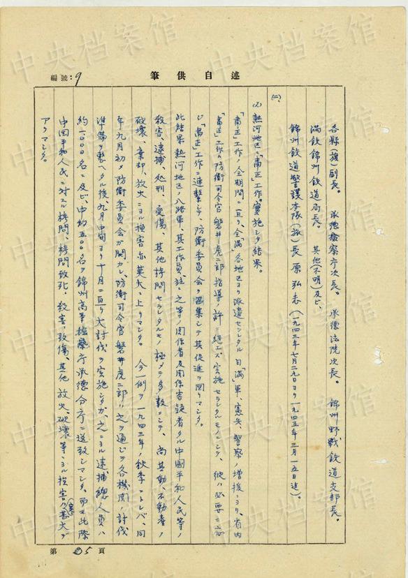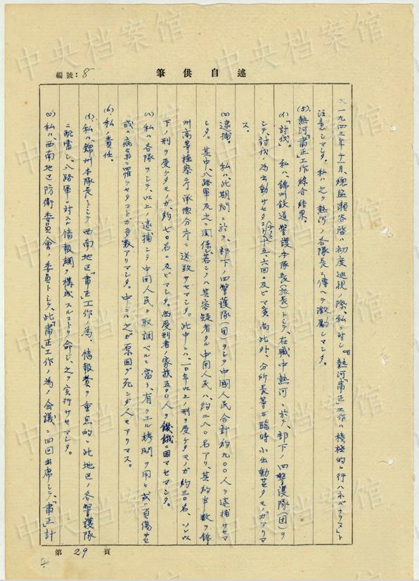 1943年7月以後、西南地區(qū)防衛(wèi)委員會委員として、熱河地區(qū)粛正工作のための會議に出席し、各鎮(zhèn)圧機関に八路軍及び中國平和人民に対する討伐、逮捕、鎮(zhèn)圧を行わせた。9月、10月の2度の「大討伐」だけで、熱河全省內(nèi)で抗日工作人員及び抗日の中國人民約1000人を逮捕し、うち約500人を錦州高等検察庁承徳分庁に送致した。「中國平和人民ニ対スル拷問、拷問致死、殺害、致傷、其他放火、破壊等ニヨル殺害ハ甚大デアリマシタ」。(編集NA)