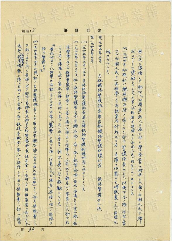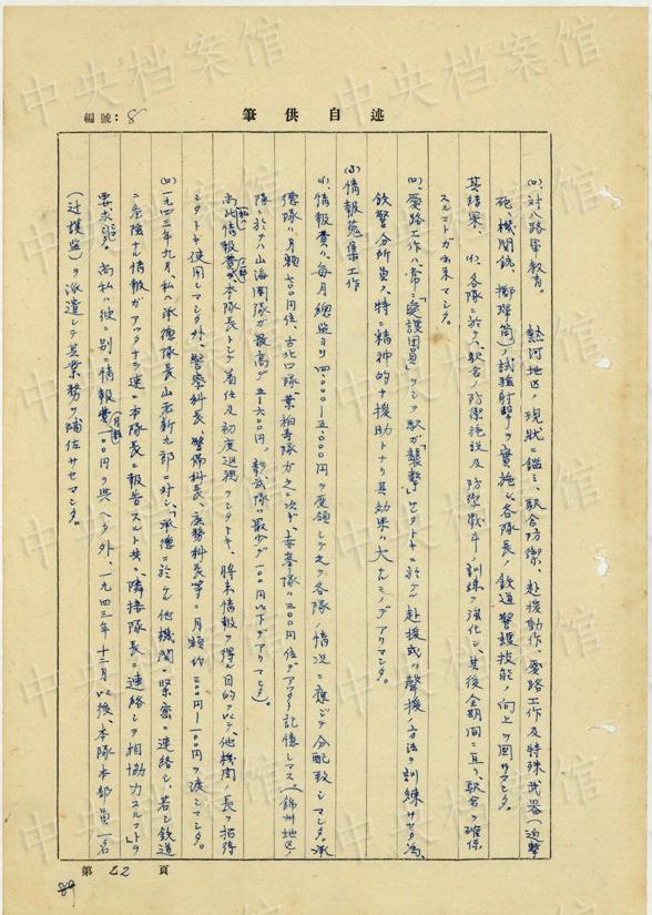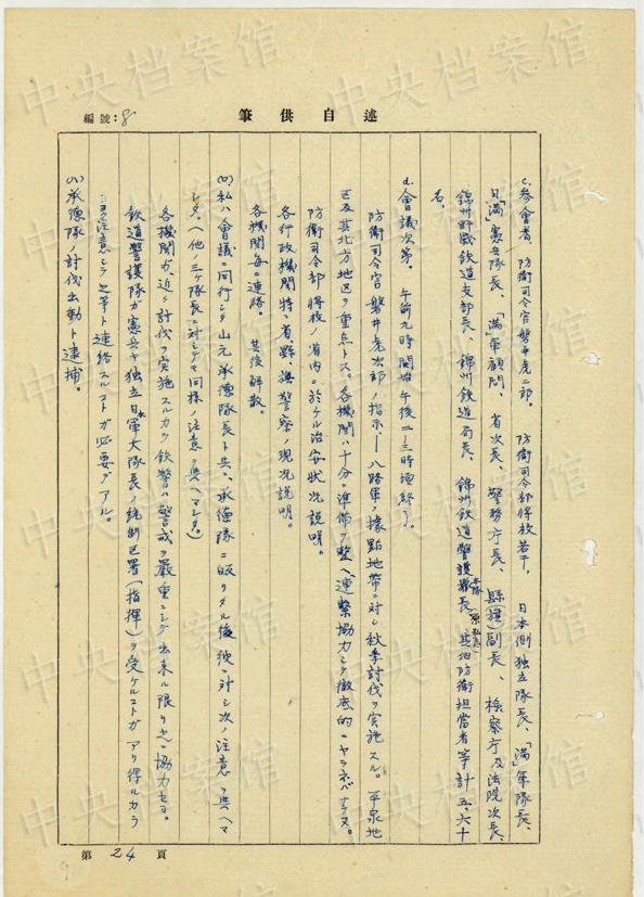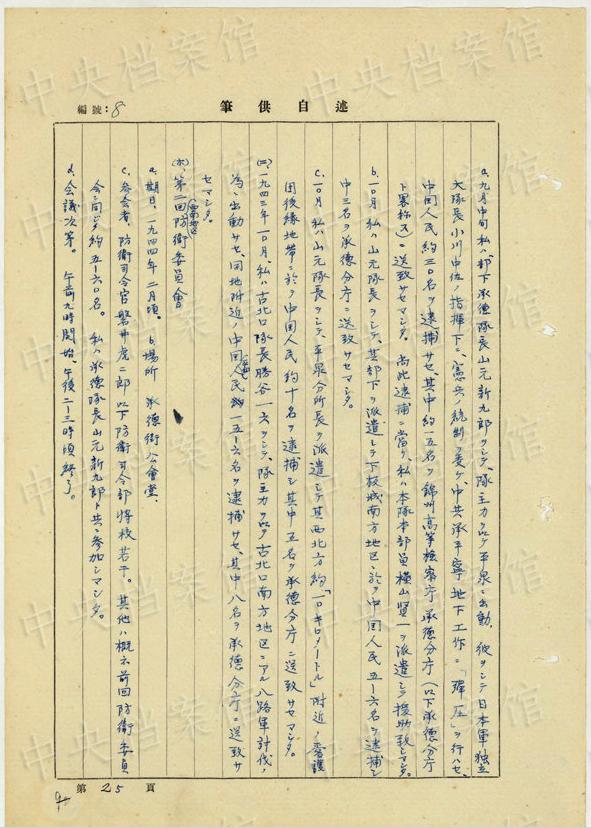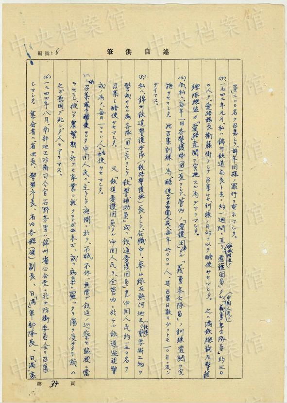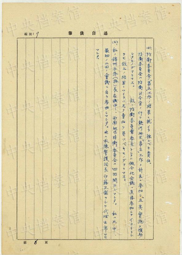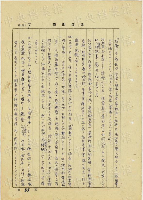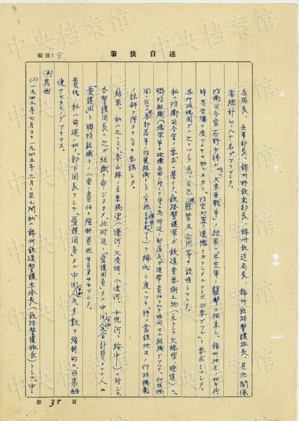1943年7月以後、西南地區(qū)防衛(wèi)委員會委員として、熱河地區(qū)粛正工作のための會議に出席し、各鎮(zhèn)圧機関に八路軍及び中國平和人民に対する討伐、逮捕、鎮(zhèn)圧を行わせた。9月、10月の2度の「大討伐」だけで、熱河全省內(nèi)で抗日工作人員及び抗日の中國人民約1000人を逮捕し、うち約500人を錦州高等検察庁承徳分庁に送致した。「中國平和人民ニ対スル拷問、拷問致死、殺害、致傷、其他放火、破壊等ニヨル殺害ハ甚大デアリマシタ」。(編集NA)