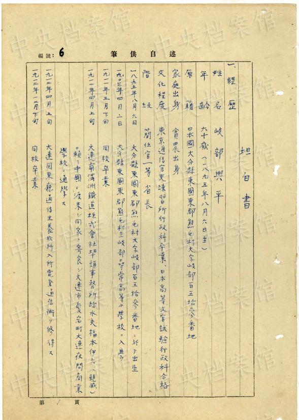 日本人戦犯?岐部與平の1954年7月の供述書(shū)によると、岐部は1895年に日本の大分県で生まれた。1921年6月には日本関東庁理事官?偽大連民政署財(cái)務(wù)課課長(zhǎng)、1944年4月には偽満洲國(guó)厚生會(huì)理事長(zhǎng)に任じられた。1945年10月26日、長(zhǎng)春でソ連軍によって逮捕された。