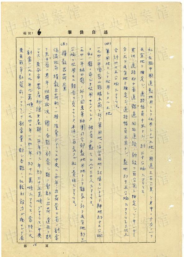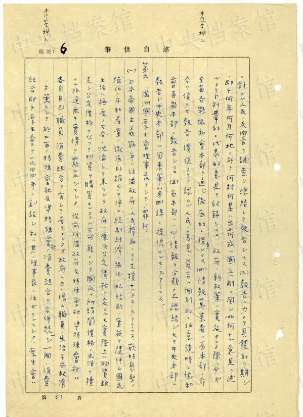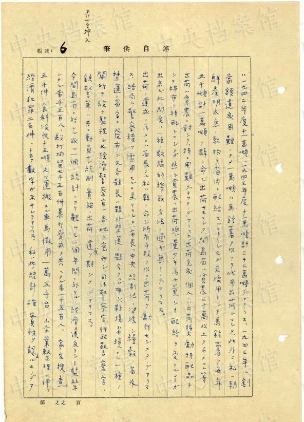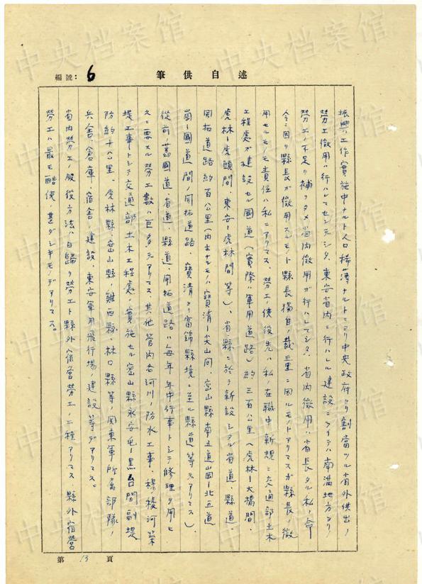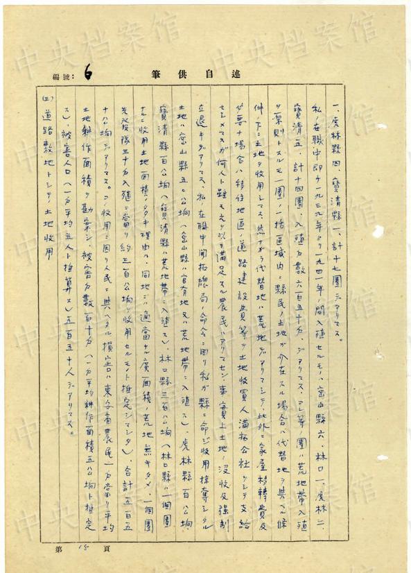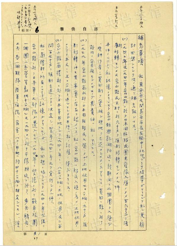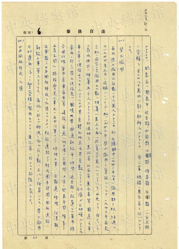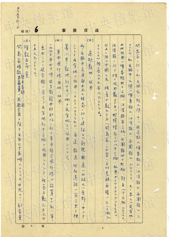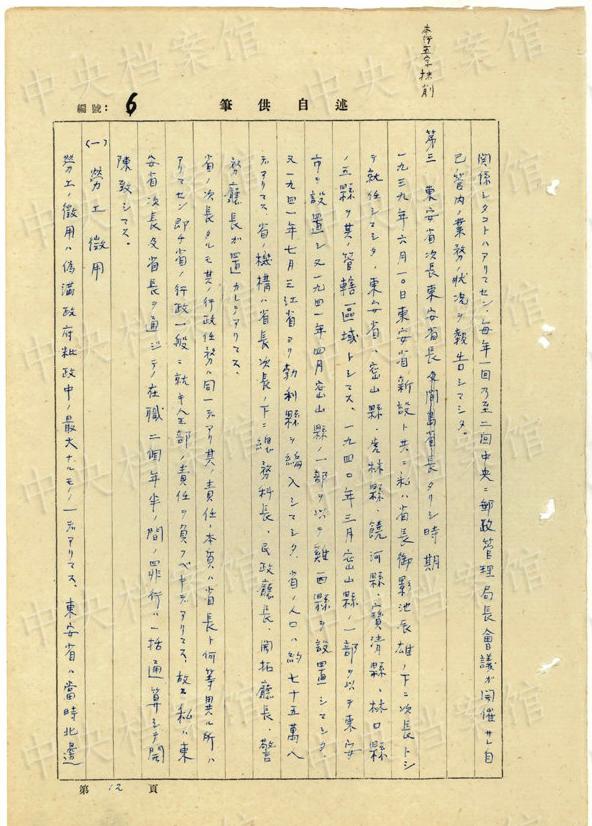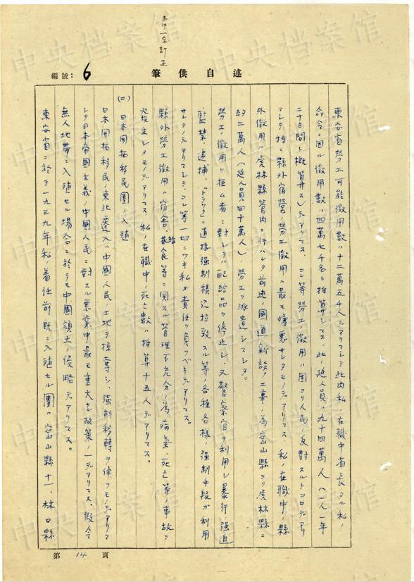 1939年6月以降、偽安東省省長(zhǎng)在任中、労工として徴用を命じた中國(guó)人民は「四萬(wàn)七千名ト推算」され、「宿舎、給食等ニ関スル管理不充分ノ為病気、死亡等ノ事故ヲ発生シタモノデアリマス」。「死亡數(shù)ハ推算十五人デアリマス」