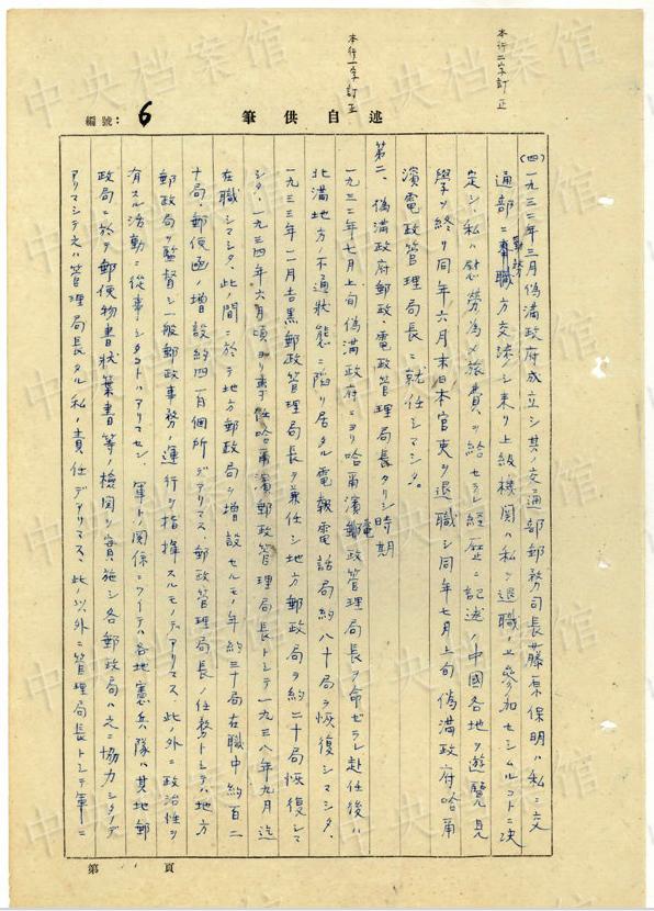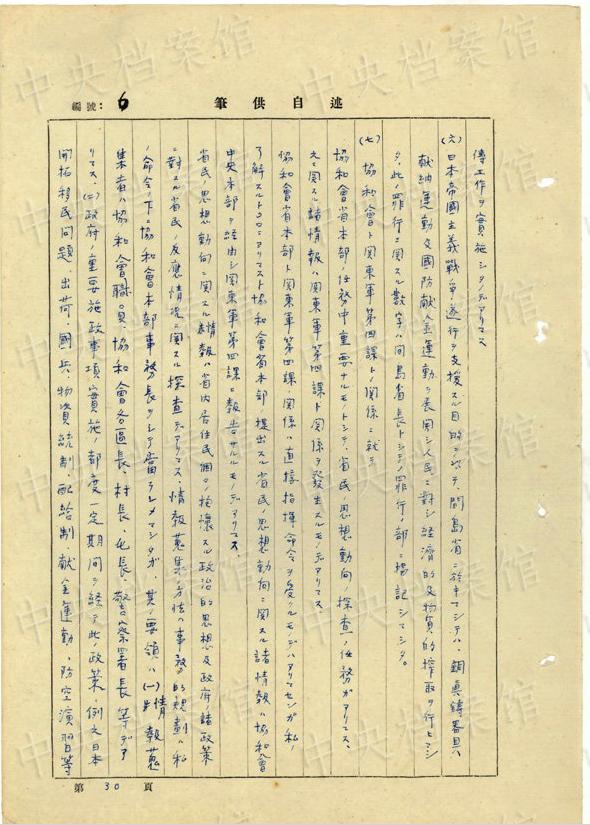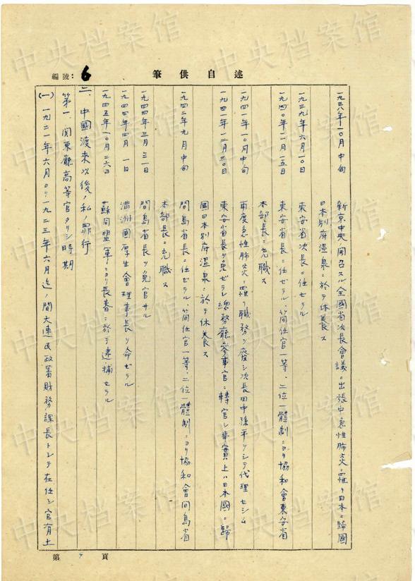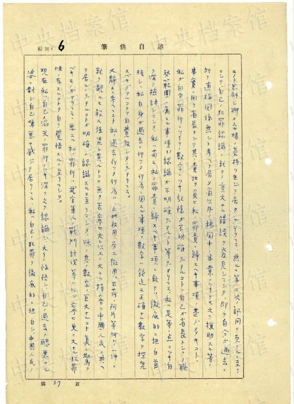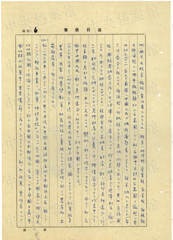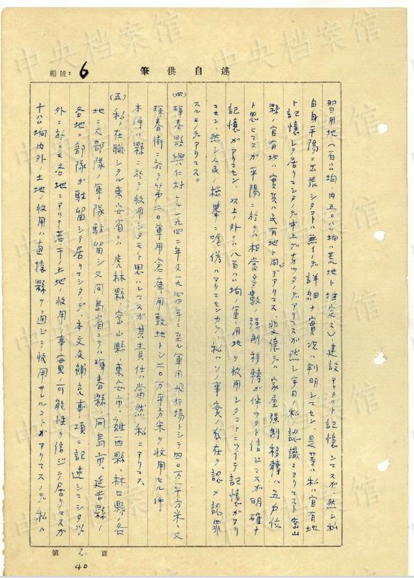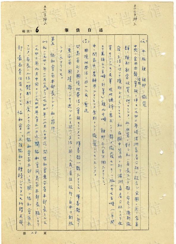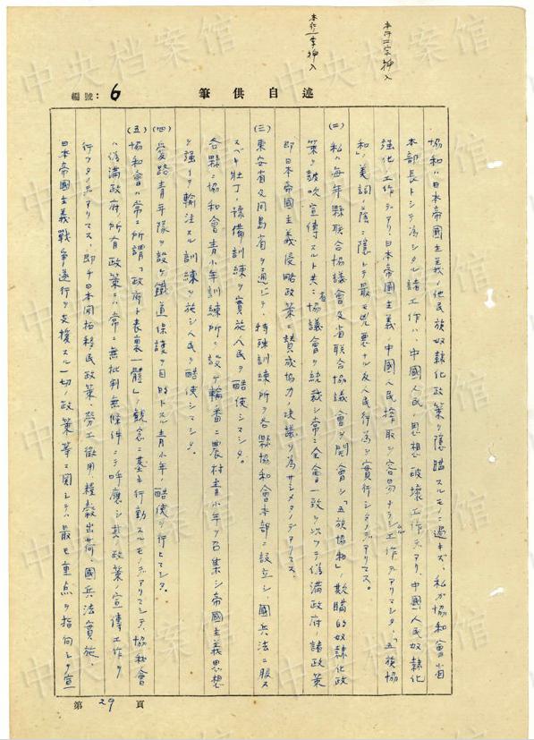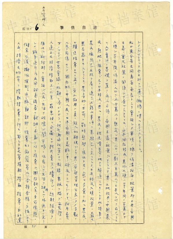 1939年6月以降、偽安東省省長(zhǎng)在任中、労工として徴用を命じた中國(guó)人民は「四萬(wàn)七千名ト推算」され、「宿舎、給食等ニ関スル管理不充分ノ為病気、死亡等ノ事故ヲ発生シタモノデアリマス」。「死亡數(shù)ハ推算十五人デアリマス」