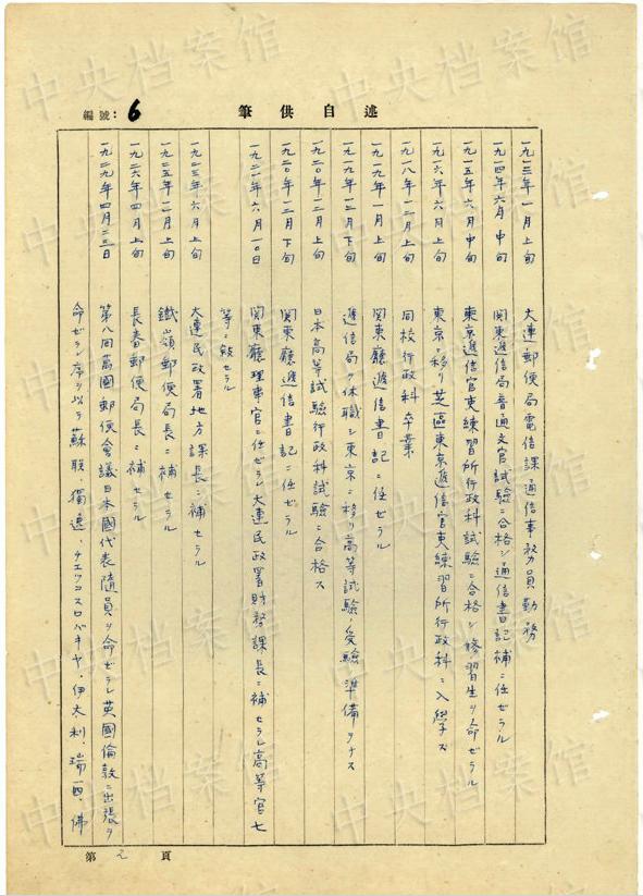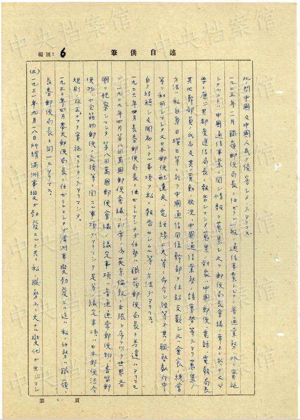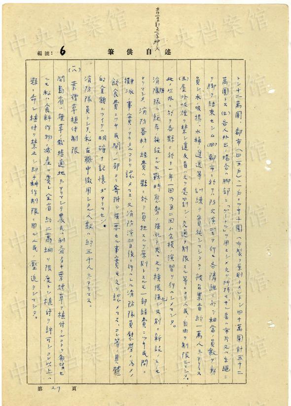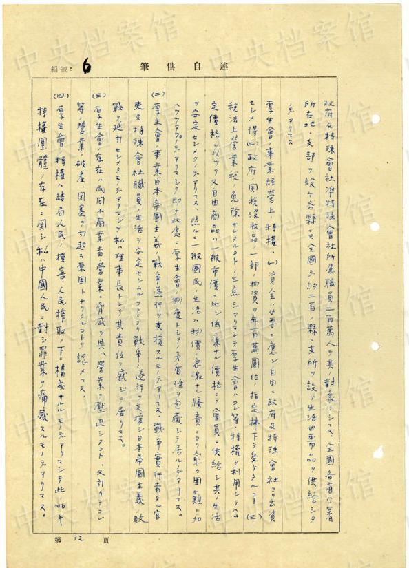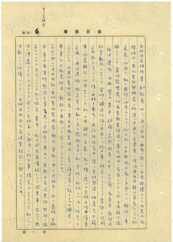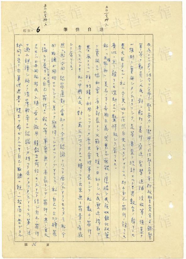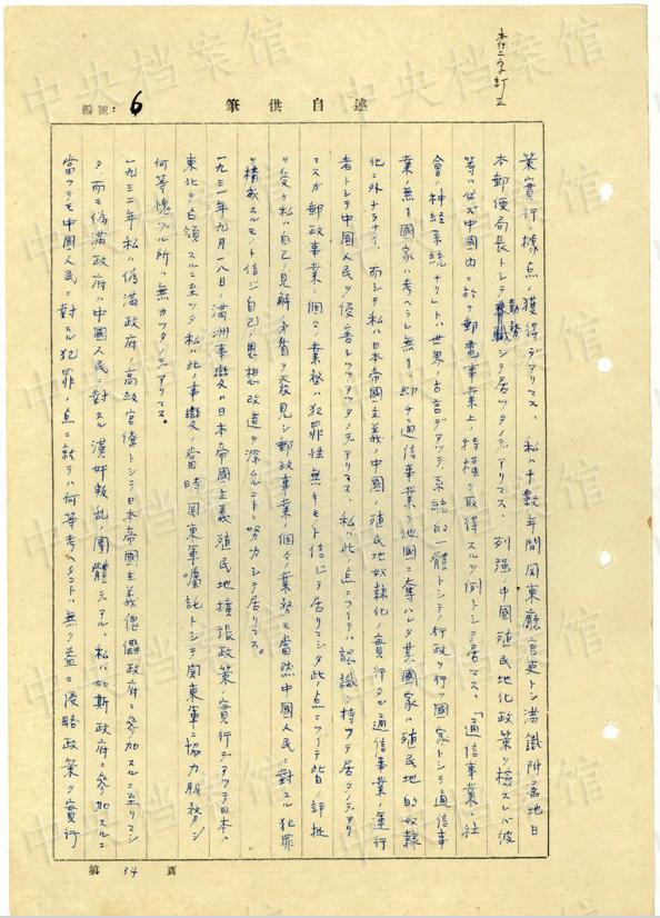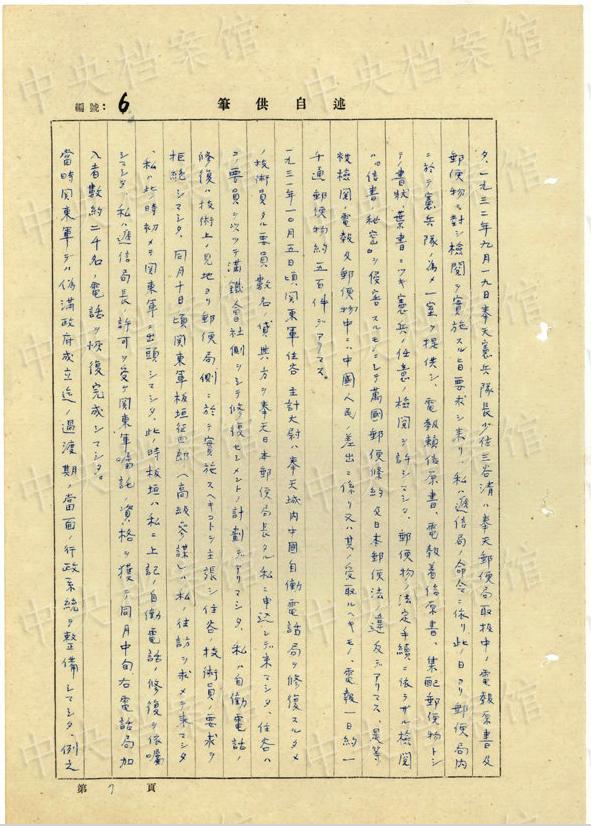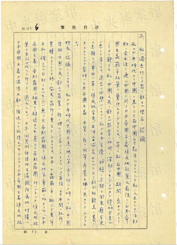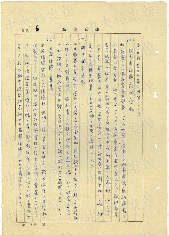 1939年6月以降、偽安東省省長(zhǎng)在任中、労工として徴用を命じた中國(guó)人民は「四萬(wàn)七千名ト推算」され、「宿舎、給食等ニ関スル管理不充分ノ為病気、死亡等ノ事故ヲ発生シタモノデアリマス」。「死亡數(shù)ハ推算十五人デアリマス」