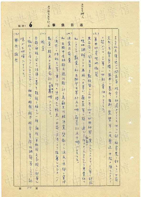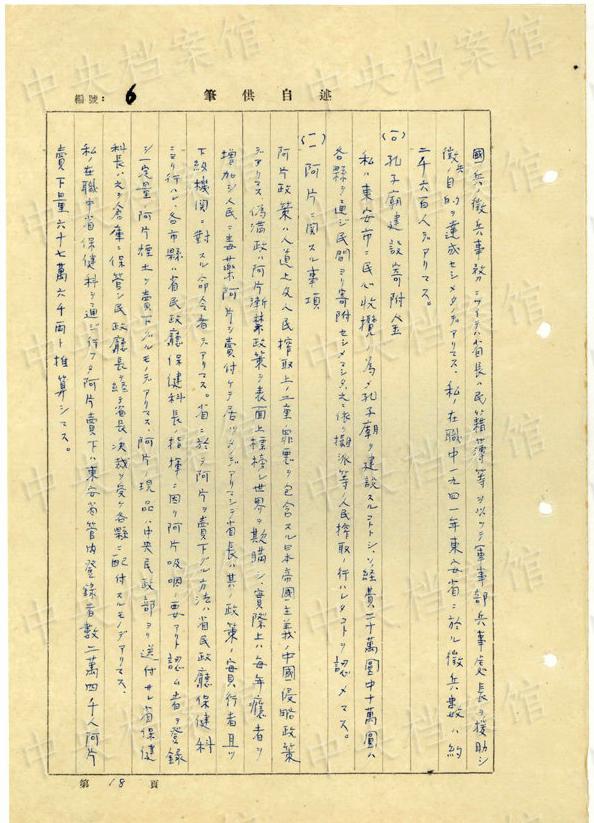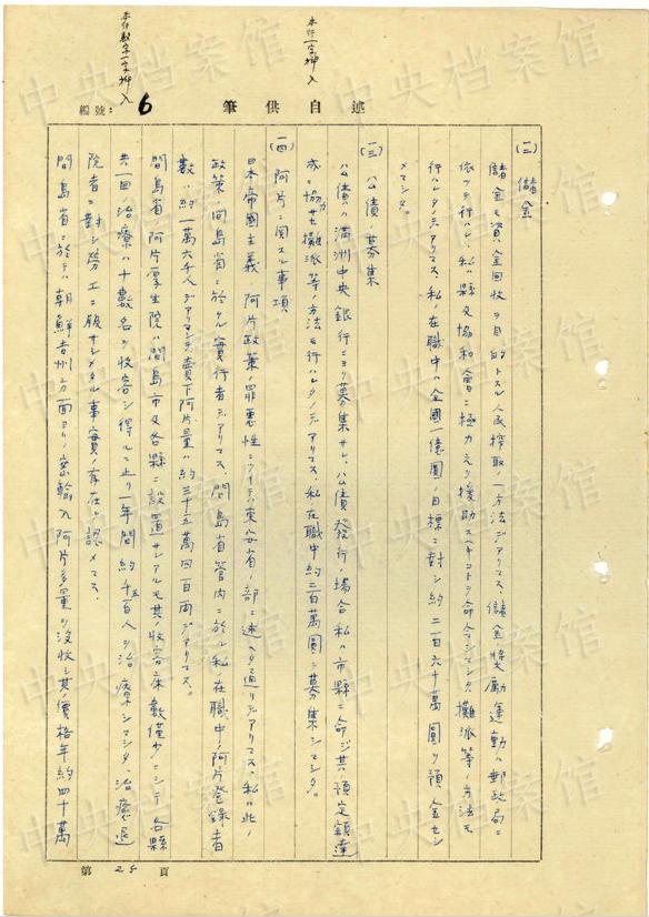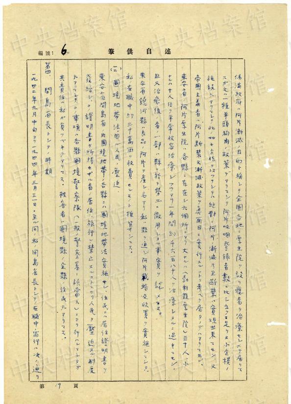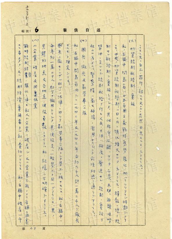 1942年から1943年までは、管轄地域で中國(guó)人の徴兵を行い、「一萬(wàn)二千人ヲ徴兵セルモノト推定シマス。國(guó)兵ニ徴セラレザル壯丁ハ法律ニ因ッテ勤労奉公隊(duì)トシテ労工ニ服サセマス。私ノ在職中ハ毎年約一萬(wàn)二千人の壯丁ヲ徴用シマシタ。其ノ使役先ハ一般労工ト同一デアリマス」。さらに管內(nèi)の中國(guó)人にアヘンを販売し、「売下阿片量ハ約三十五萬(wàn)四百両デアリマス」(編集MA)