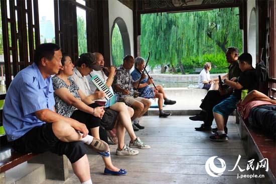 公園の一角 美しい中國伝統(tǒng)楽器の音色をバックに歌をうたう人々