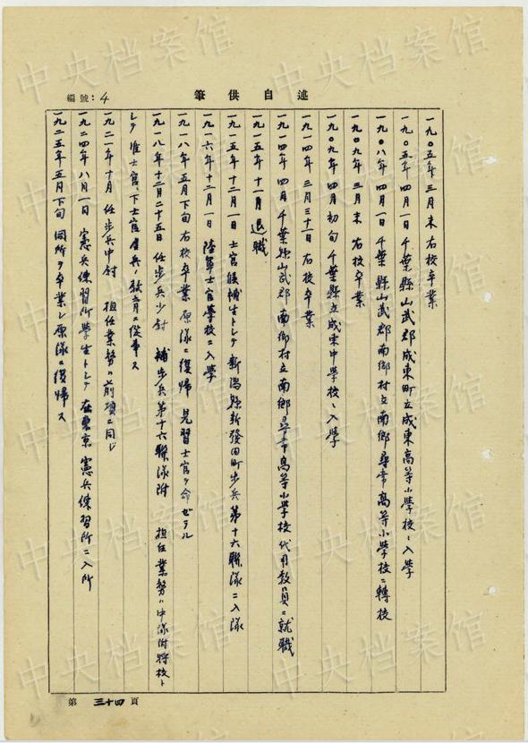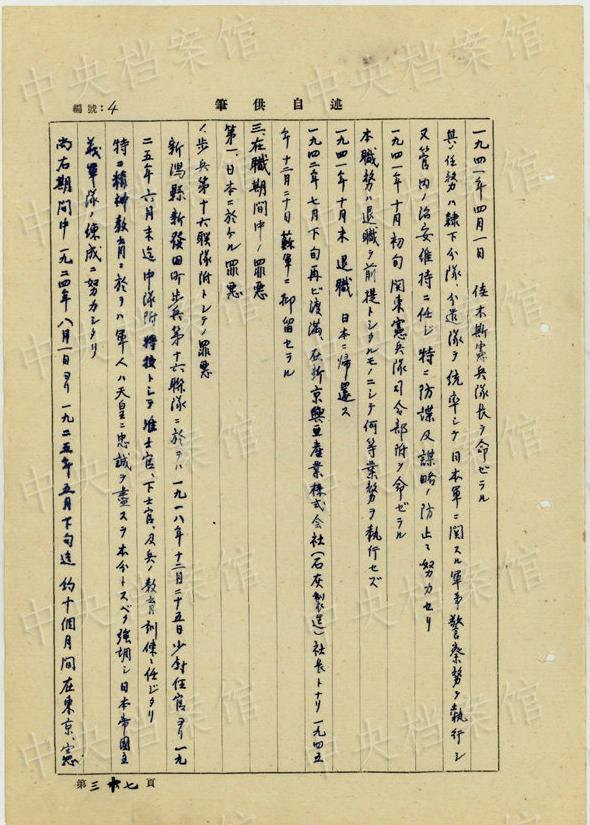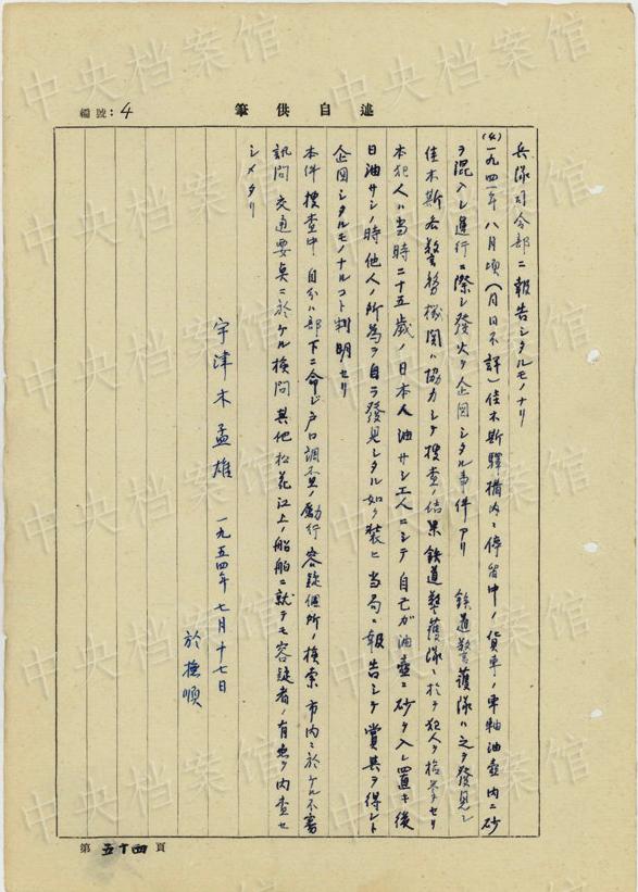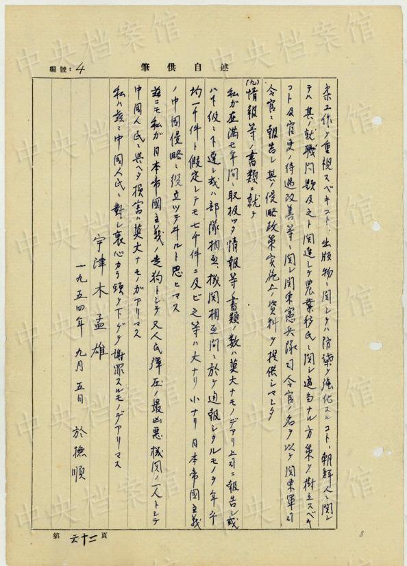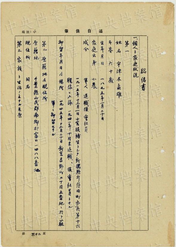 日本人戦犯?宇津木孟雄の1954年7月から9月の供述書(shū)によると、宇津木は1895年に日本の千葉県で生まれた。1934年に偽満憲兵隊(duì)顧問(wèn)に任じられ、1942年7月に新京興亜産業(yè)公司社長(zhǎng)に就任した。1945年12月20日、長(zhǎng)春でソ連軍に逮捕された。