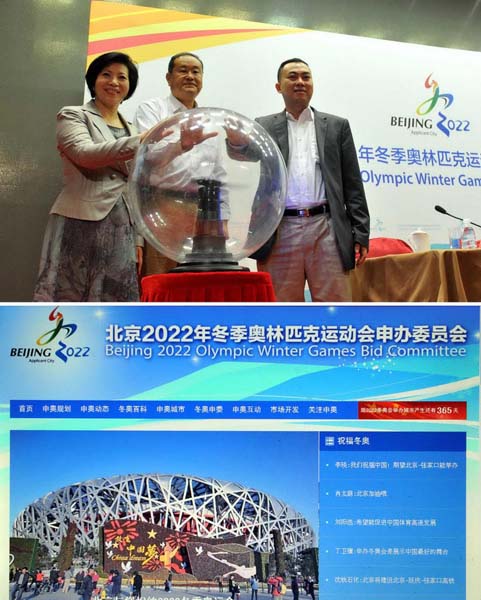 | 7月31日、北京2022年冬季五輪招致委員會の公式ウェブサイト(上寫真)、北京2022年冬季五輪招致委員會の公式ウェブサイト運用開始のガラスボールに手を添えるゲスト(下寫真)。 |