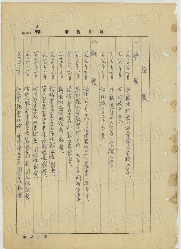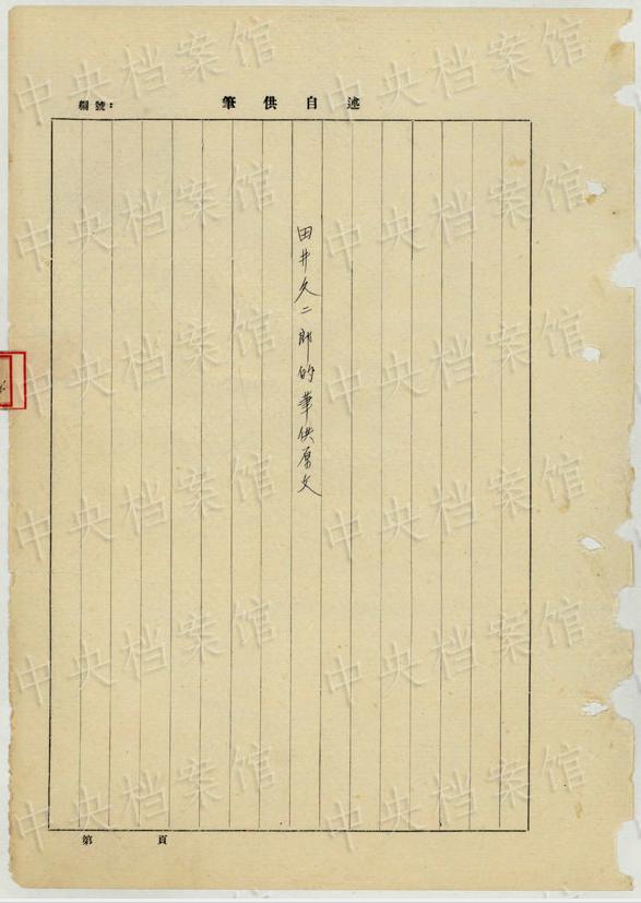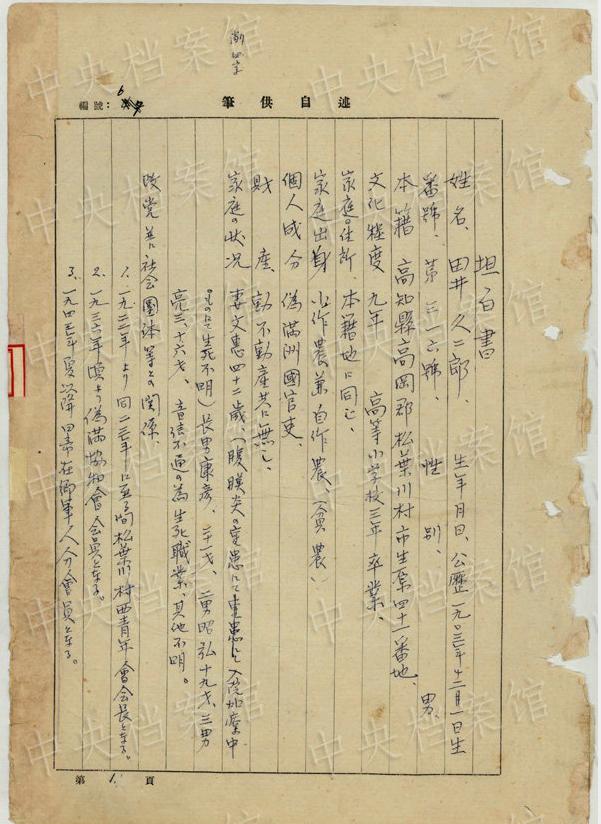 日本人戦犯?田井久二郎の1954年7月の供述書によると、田井は1903年に日本の高知県で生まれた。1933年9月には偽北満特別區(qū)公署警務(wù)処特務(wù)科附屬官に任じられ、1944年4月には偽満竜江省斉斉哈爾市警察局特務(wù)科科長?市警正に任じられた。