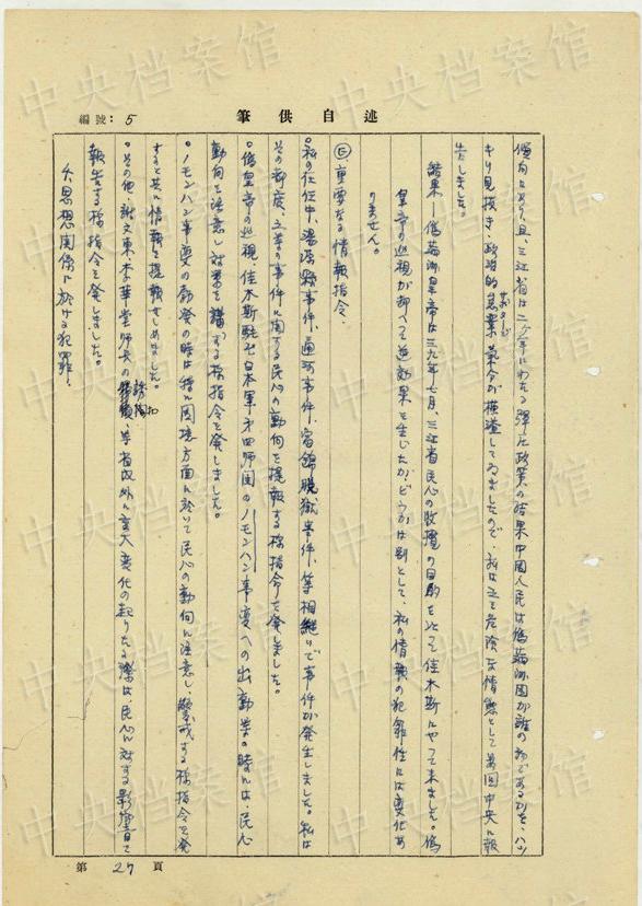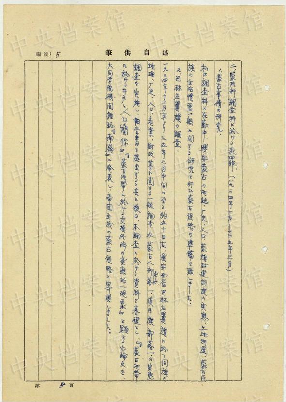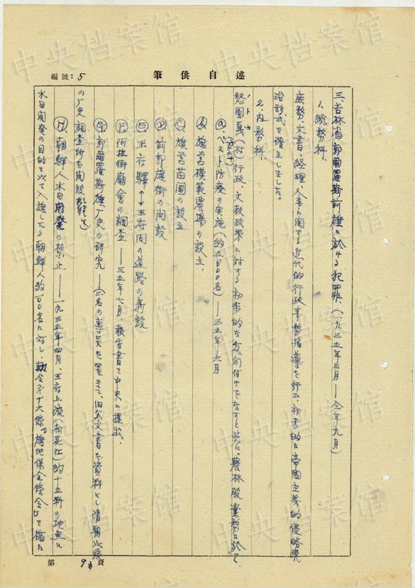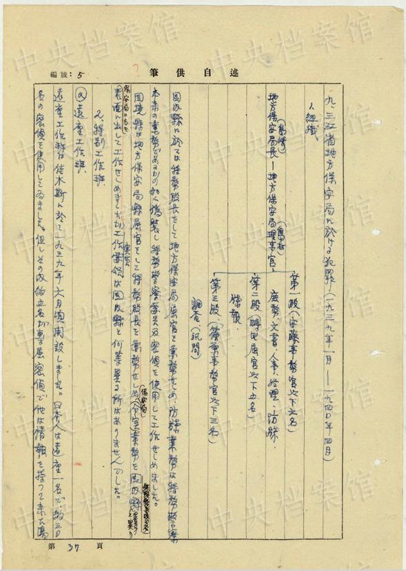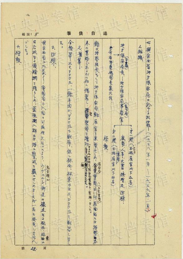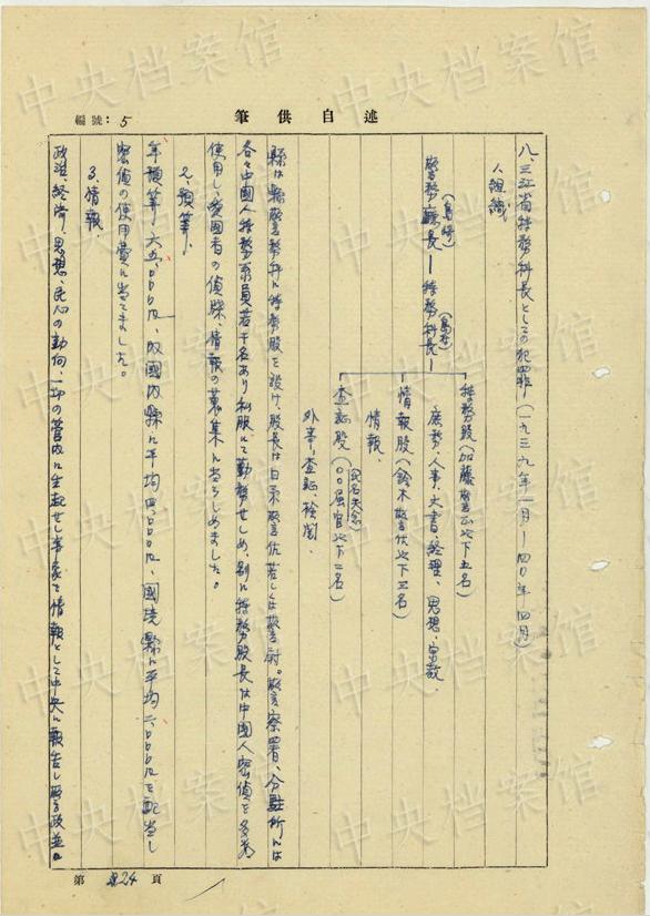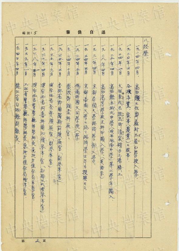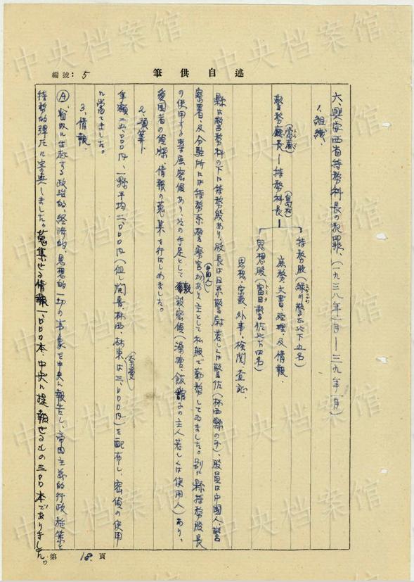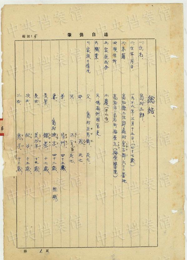 日本人戦犯?島村三郎の1954年7月の供述書によると、島村は1908年に日本の高知県で生まれた。1934年10月に偽満蒙蔵部調(diào)査科屬官、1945年7月に偽警務(wù)総局特務(wù)処調(diào)査科科長(zhǎng)?偽中央保安局第5課科長(zhǎng)に任じられた。
