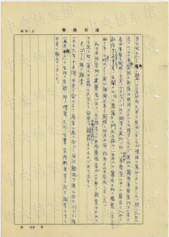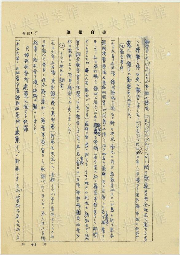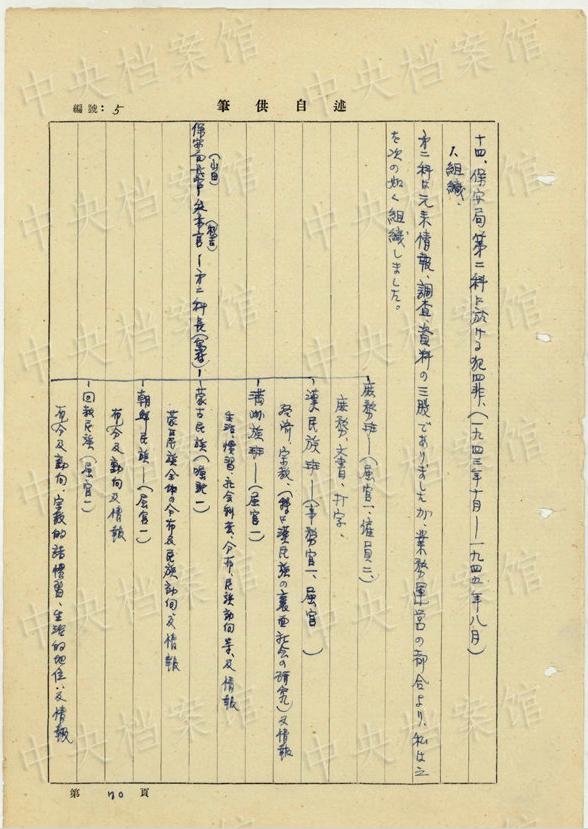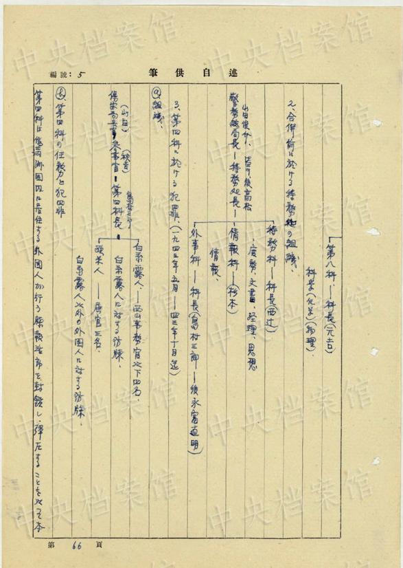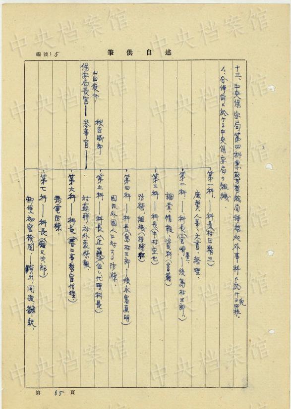 日本人戦犯?島村三郎の1954年7月の供述書によると、島村は1908年に日本の高知県で生まれた。1934年10月に偽満蒙蔵部調(diào)査科屬官、1945年7月に偽警務(wù)総局特務(wù)処調(diào)査科科長(zhǎng)?偽中央保安局第5課科長(zhǎng)に任じられた。