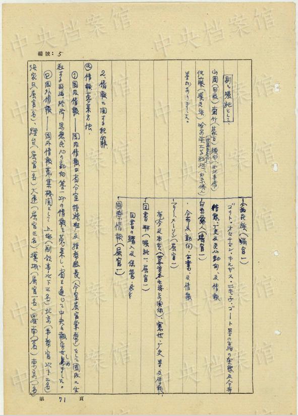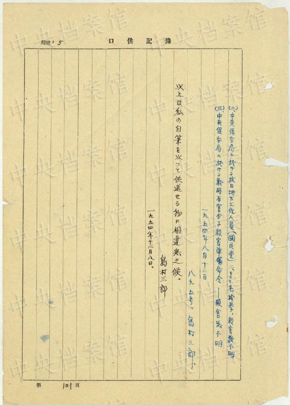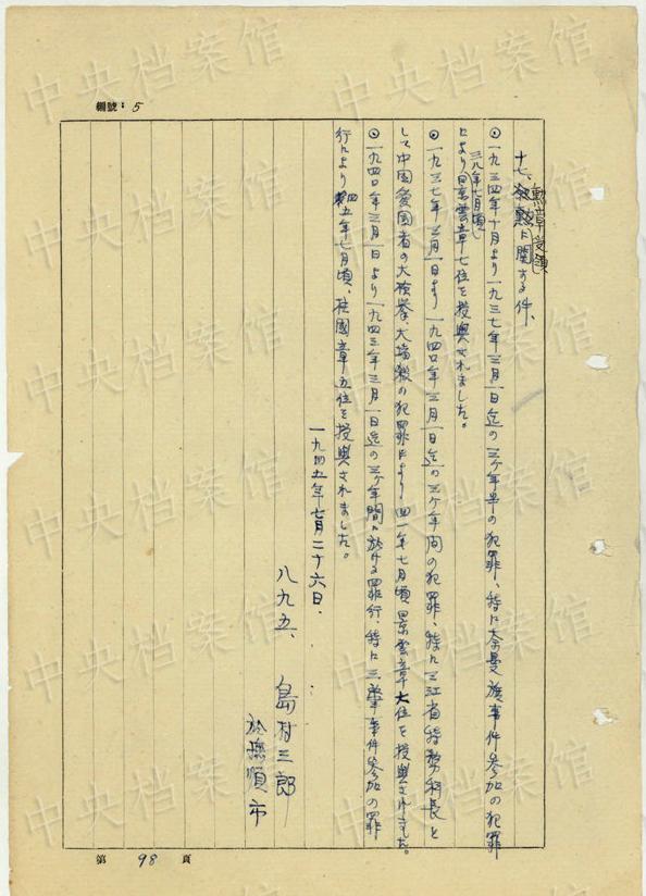 日本人戦犯?島村三郎の1954年7月の供述書によると、島村は1908年に日本の高知県で生まれた。1934年10月に偽満蒙蔵部調(diào)査科屬官、1945年7月に偽警務(wù)総局特務(wù)処調(diào)査科科長(zhǎng)?偽中央保安局第5課科長(zhǎng)に任じられた。