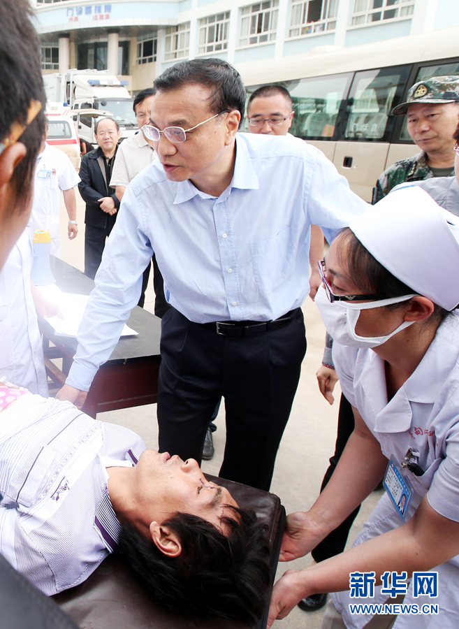 李克強総理は5日早朝、雲(yún)南省の魯?shù)楸h人民病院を訪れ、地震で負傷した人々を見舞い、醫(yī)師や看護師を慰労した。