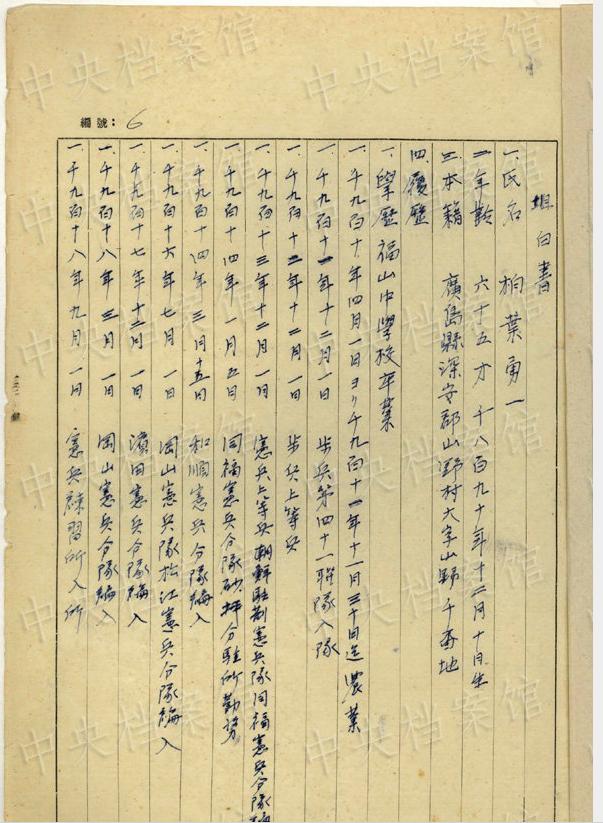 日本人戦犯?柏葉勇一の1954年7月から8月の供述書によると、柏葉は1890年に日本の広島県で生まれた。1932年に中國東北部で中國侵略戦爭に參加し、海倫憲兵分遣隊長や偽満洲國撫順市警察局局長などの職を務めた。