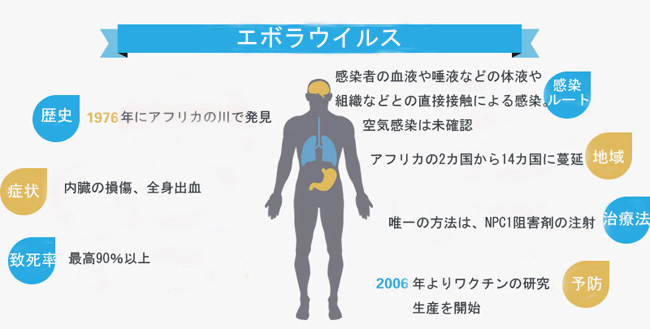 エボラウイルス(モノネガウイルス目フィロウイルス科に屬するウイルスの1屬)は人類(lèi)と霊長(zhǎng)類(lèi)のエボラ出血熱を引き起こす急性のウイルスで、致死率は50?90%と高い。主な死因は脳卒中、心筋梗塞、乏血性ショック。ウイルスの名稱(chēng)は、コンゴ民主共和國(guó)(當(dāng)時(shí)ザイール)のエボラ川で発見(jiàn)されたことにちなんでおり、モノネガウイルス目フィロウイルス科に屬するウイルスの1屬の総稱(chēng)となっている。<詳細(xì)へ>