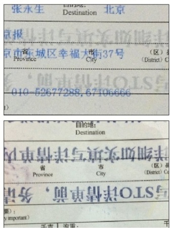 | 受取人の情報(bào)が記された速達(dá)伝票(上寫(xiě)真)?;端虼丹堡?0秒あまりで字が消えて見(jiàn)えなくなる(下寫(xiě)真)。 |