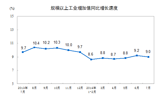 中國國家統(tǒng)計局が13日に発表した情報によると、中國の7月の一定規(guī)模以上の工業(yè)企業(yè)増加値は、前年同月比で実質(zhì)9.0%増となった。7月の増加率は、6月より0.2ポイント低下した。1?7月の一定規(guī)模以上の工業(yè)企業(yè)増加値は、前年同期比8.8%増となった。業(yè)界関係者は、「このデータは、経済がやや改善されたが、その基礎(chǔ)が依然として脆弱であることを意味する。今後は安定成長の現(xiàn)行政策を徹底する必要がある」と指摘した。南方日報が伝えた。