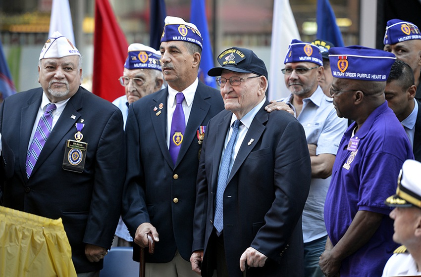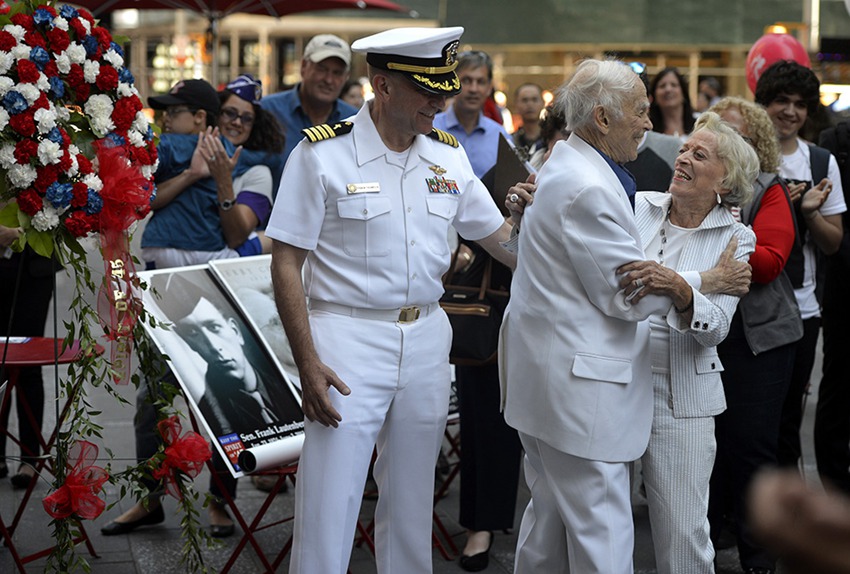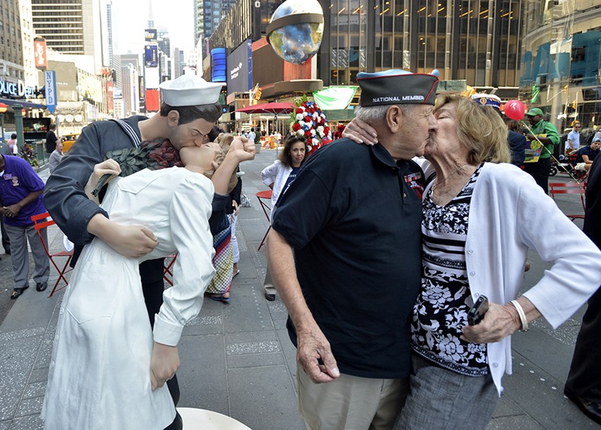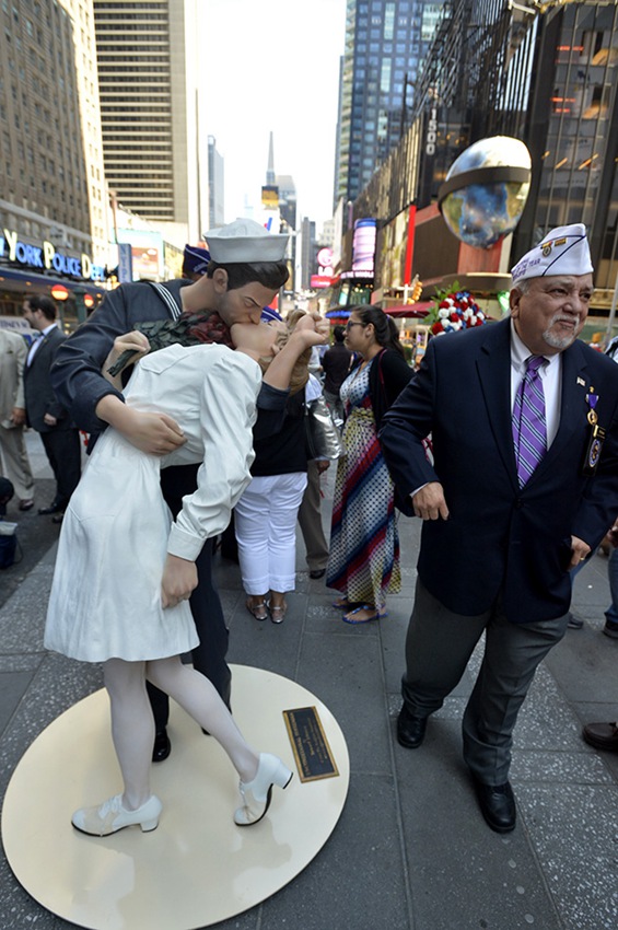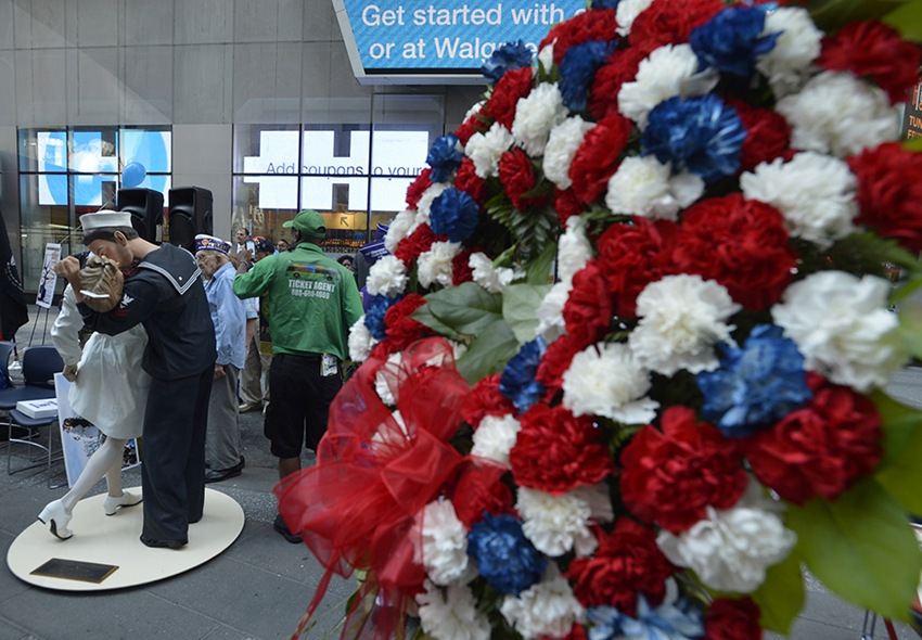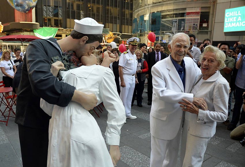 高さ約160センチの彫像「勝利のキス」の除幕式が14日、米ニューヨークのタイムズスクエアで行なわれた。第2次世界大戦に參加した経歴を持つ米國の元兵士が除幕式に參加し、タイムズスクエアの観光客や市民と共に日本の降伏と第2次世界大戦の勝利69周年を祝った。新華社が伝えた。(編集YH)