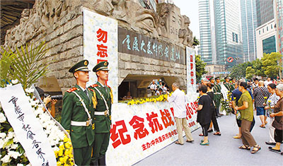 「國(guó)辱を忘れるな、中華の夢(mèng)を?qū)g現(xiàn)させよう」をテーマとする「抗日戦爭(zhēng)」(日本の呼稱?日中戦爭(zhēng))勝利69周年記念のイベントが15日、重慶市渝中區(qū)較場(chǎng)口にある重慶大爆撃の跡地で行われた。爆撃の生存者の代表や市民ら約500人が參加し、爆撃で命を落とした同胞たちに花を供えた。