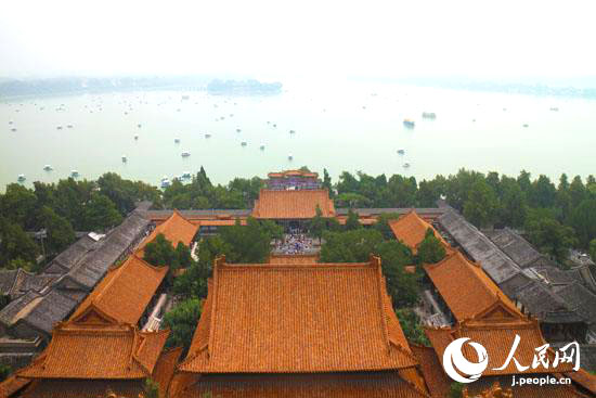 仏香閣からの昆明湖の眺め この日は曇りで靄がかかったような天気