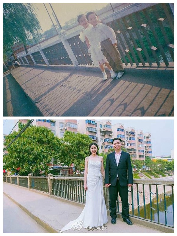 6歳の時、王子恒くんは友達の茜茜ちゃんをお嫁さんにしたいとこっそりと母親に打ち明けた。當時、彼は愛情とは何かをまだ理解しておらず、その年に引っ越すことになって茜茜ちゃんと別れる時もそれほど悲しまずに、家の近くの南関街熊児河橋近くで記念撮影をしただけだった。しかし思いがけず18年後に再び彼らが再會した時、彼はすぐに彼女に戀してしまった。このほど2人はかつて寫真を撮った橋の側(cè)で再び記念撮影を行ったが、今回の寫真は結(jié)婚記念寫真だった。このロマンチックなエピソードは河南省鄭州市で起こった。大河報が伝えた。