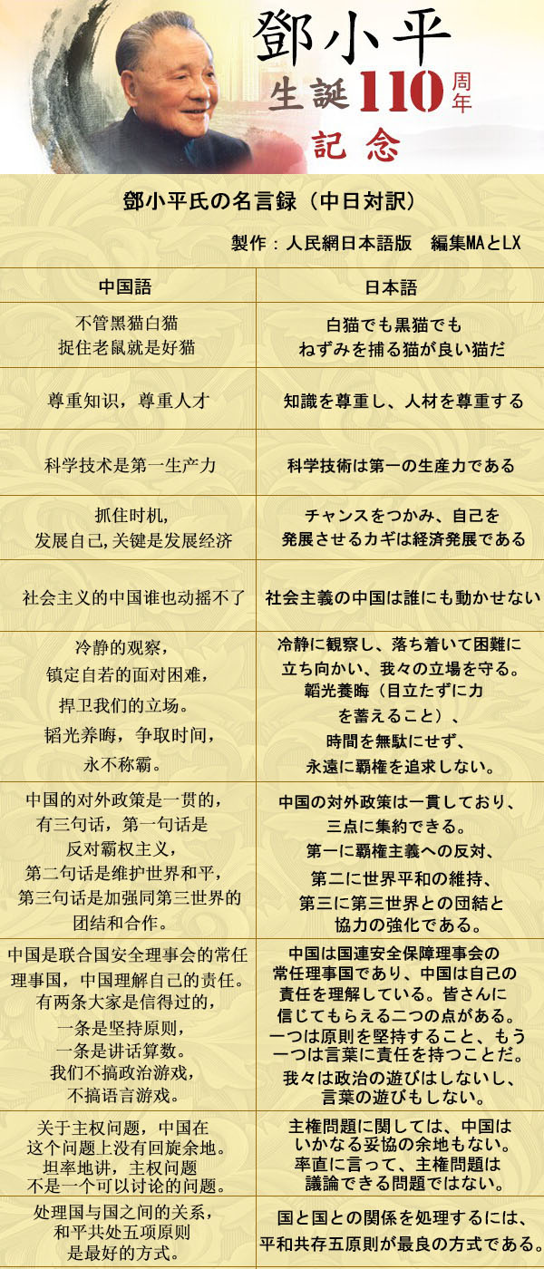 今年8月22日は鄧小平氏生誕110周年記念に當たる。鄧小平氏は偉大なマルクス主義者であるとともに、無産階級の革命家、政治家、外交家であり、中國共産黨?中國人民解放軍?中華人民共和國の主要な指導者の1人であり、中國の社會主義による改革開放と現(xiàn)代化建設の総設計師であり、「鄧小平理論」の創(chuàng)始者でもある。中華人民共和國の建國と建設に卓絶した貢獻を果たした。人民網(wǎng)が鄧小平氏の名言の數(shù)々を以上にまとめて紹介している。(編集MAとLX)