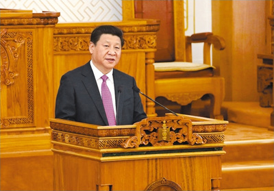 | モンゴルの國民大會(huì)議(大フラル)で重要演説を発表した習(xí)近平主席=8月22日 |