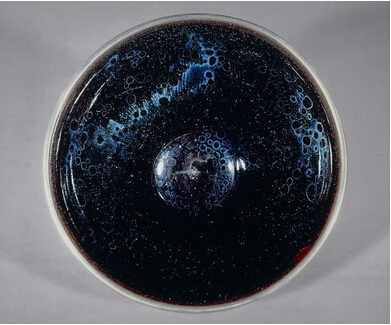 外壁にすこしの曜変の斑紋があり、茶碗內(nèi)に油滴狀曜変の斑紋が分布しており、曜変の効果が靜嘉堂文庫美術(shù)館をすこし劣る。