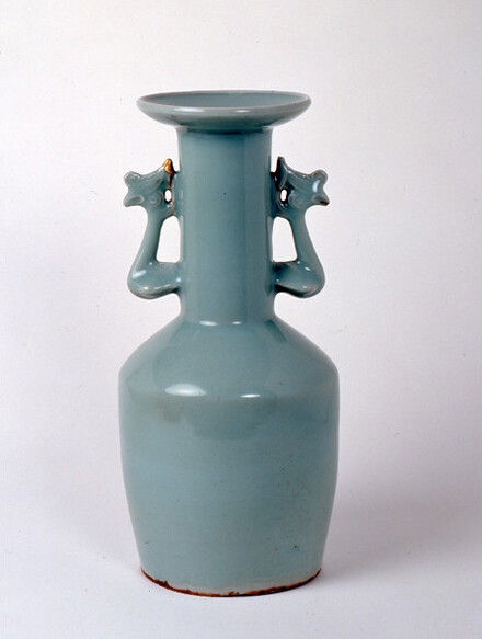 龍泉窯では南宋時代中期に粉青色の釉が厚く滑らかに掛けられた美しい青磁が完成された。日本では砧青磁の名で珍重されている。頚の左右に鳳凰を象った耳が付く瓶は、砧青磁の代表的な器形の一つである。なかでもこの作品は、調和のとれた端正な器形,青く澄んだ美しい釉調をみせている。 松永安左エ門氏が寄贈したものだ。
