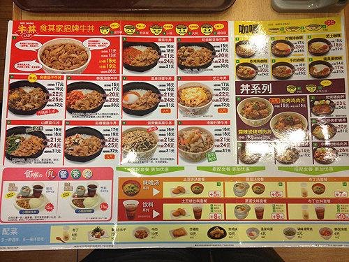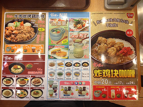 メニューから見ると、日本で販売されているうなぎ類がないことを除いて、ほかのメニューはほとんど変わらない。この高菜マヨ牛丼は明太マヨの代わりに赤唐辛子とマヨネーズを使っているが、日本で食べた味に近いと思う。見た目は「油っぽい!」と思うかもしれないが、食べてみると唐辛子の辛味が効いていて、箸がとまらない美味しさである。