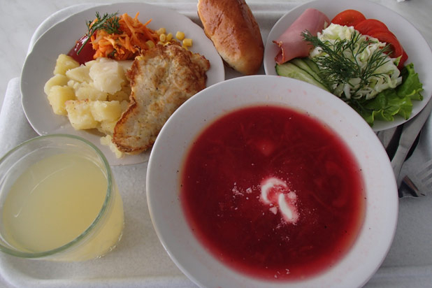 ウクライナの學生の晝食は、肉類が中心だ。最初に出されるのはボルシチを始めとするウクライナの伝統(tǒng)的なスープで、具は甜菜、野菜、肉が中心だ。次に出されるのは、ソーセージや厚切り肉などの肉類だ。學生は最後に、クッキー、ビスケット、ココアを食後のデザートとして食べる。