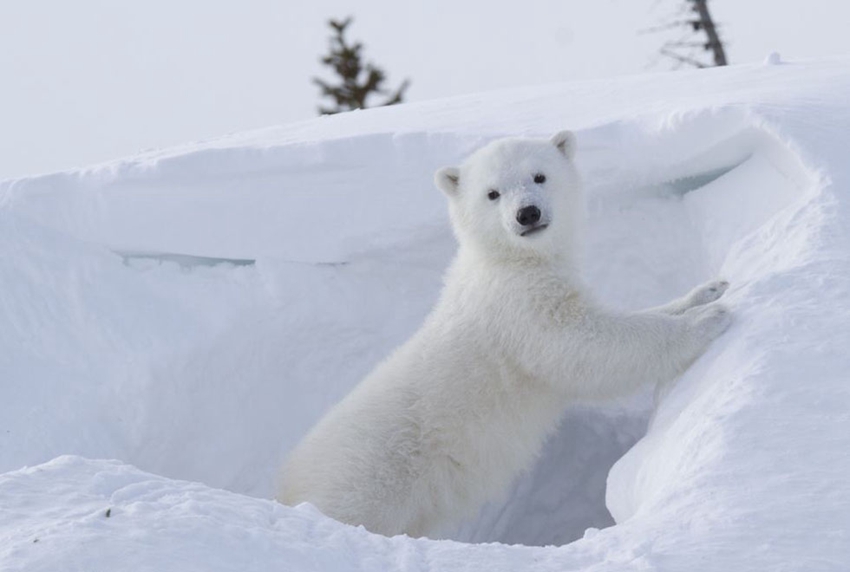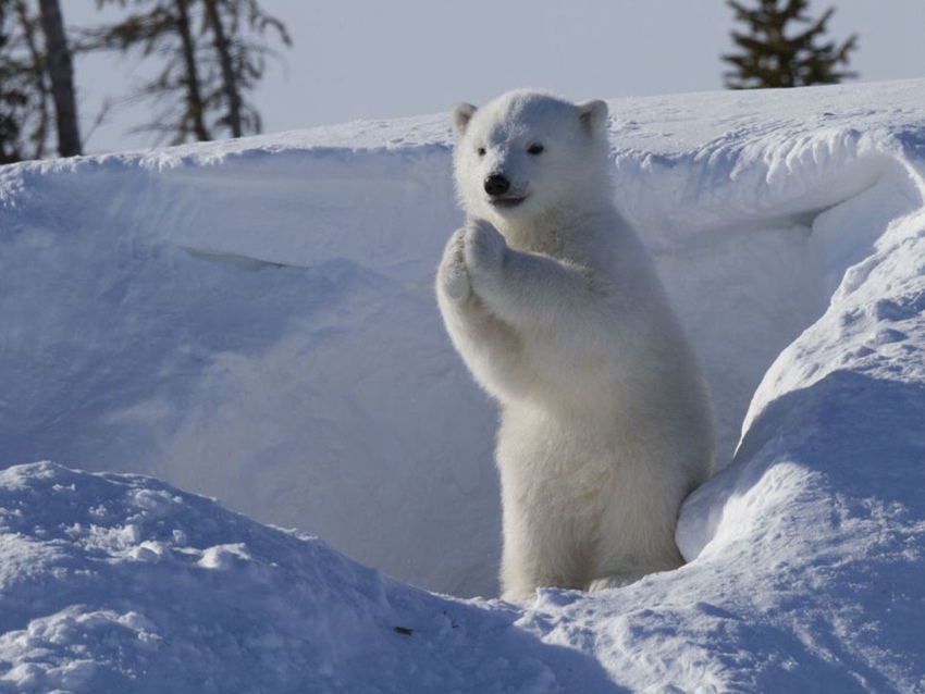 このホッキョクグマの子供は氷の洞窟から出てくると、まるでカメラマンに挨拶するように両足で立ってカメラに向って手を振り、また體の雪を払おうとしたのか両手を合わせ、その姿がまるで挨拶しているかのようでユーモラスだ。