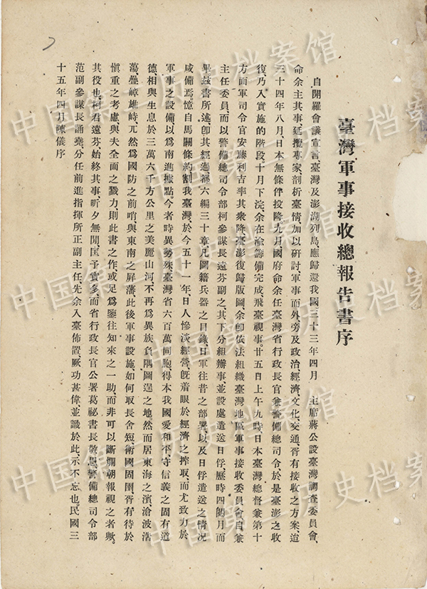 國家公文書局は6日、「偉大な勝利―中國が降伏文書を受け取る」の第23部「臺灣地區(qū)が日本の降伏を受け入れる」を公式サイトで公開した。
