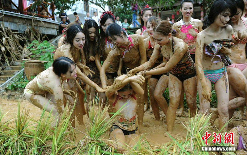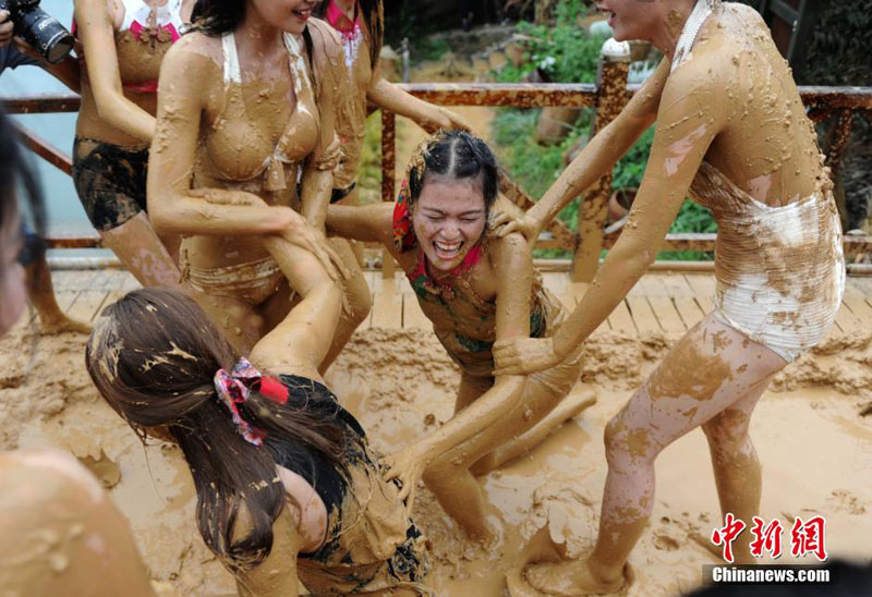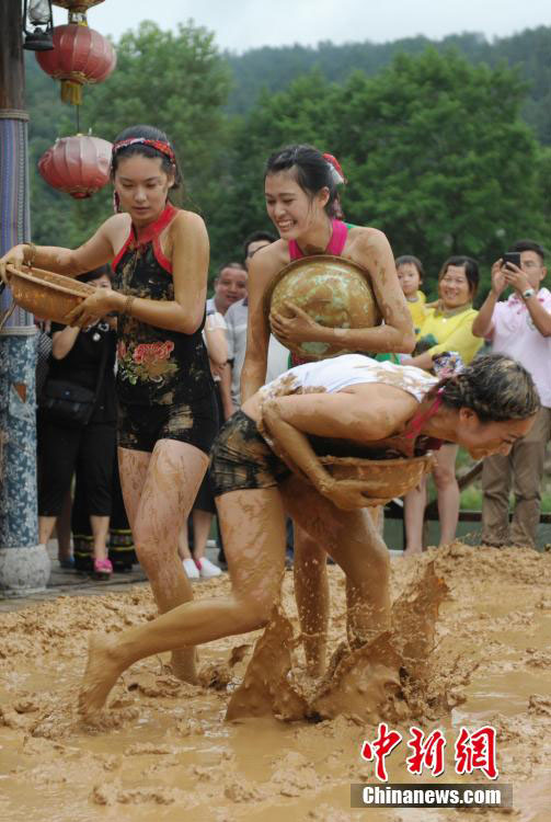 湖南省張家界溪布老街では10日、獨特の「泥合戦」が行われた。ビキニ姿や「肚兜」(腹巻きという衣類)姿の美女たちが泥の中で「激戦」を繰り広げた。中國新聞網(wǎng)が伝えた。(編集YH)